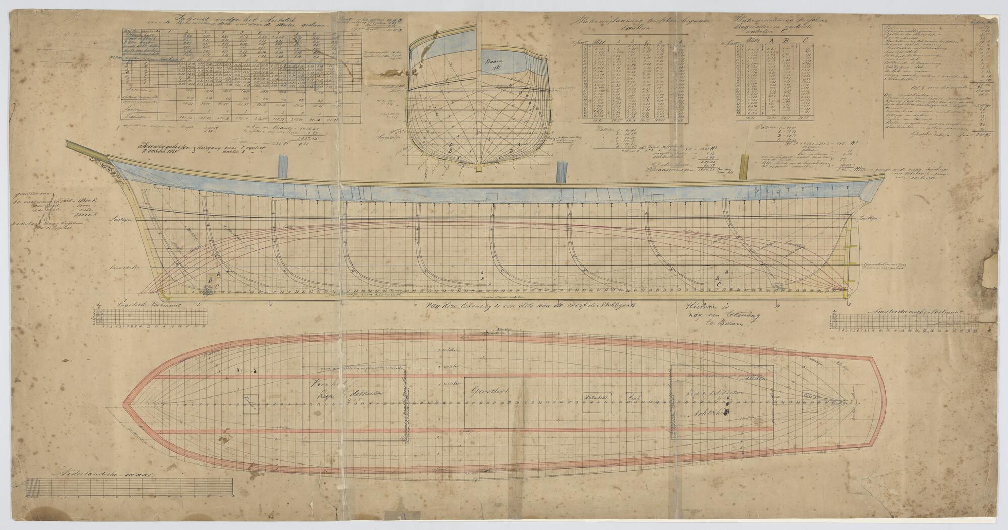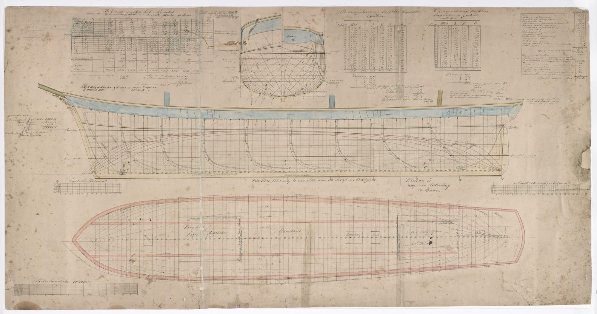 Klipperschip "Baarn": Zijaanzicht, bovenaanzicht, achteraanzicht, vooraanzicht, spantenraam, waterlijnen, verticalen, Gegevens waterverplaatsing. Afmetingen 193½ x 38.9 x 24.3½ voet.