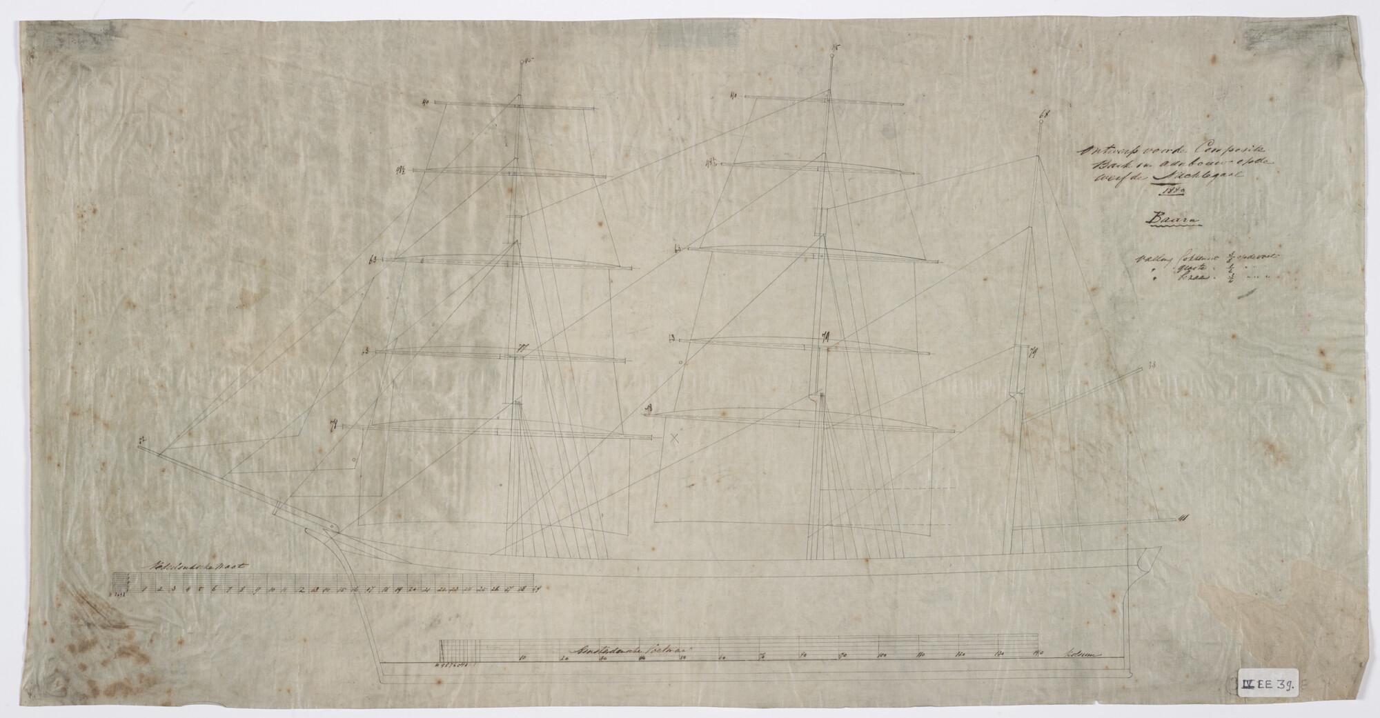 Tuigplan met lengte rondhouten van klipperschip 'Baarn'