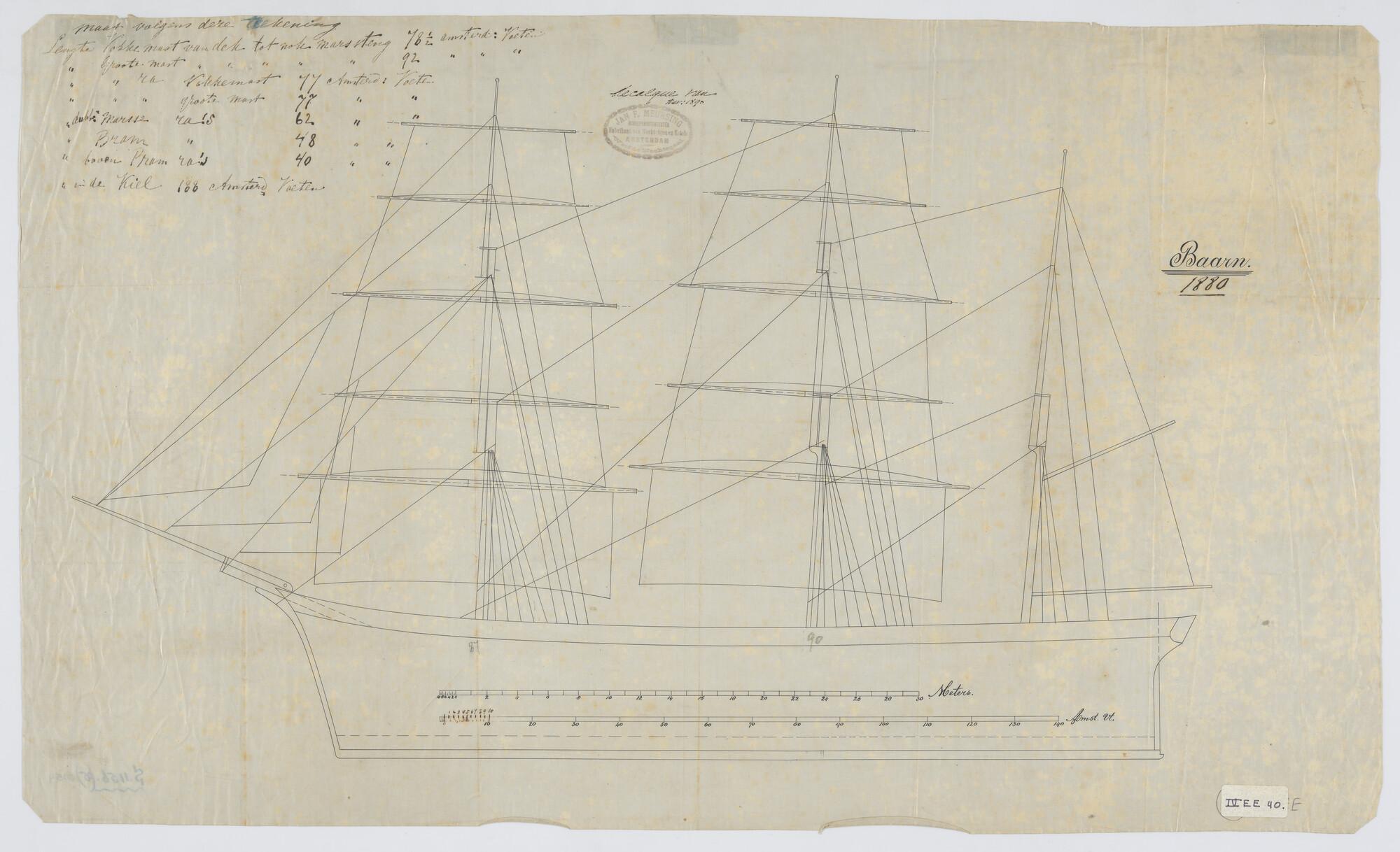 Tuigplan van het klipperschip "Baarn". Afmetingen 193½ x 38.9 x 24.3½ voet.