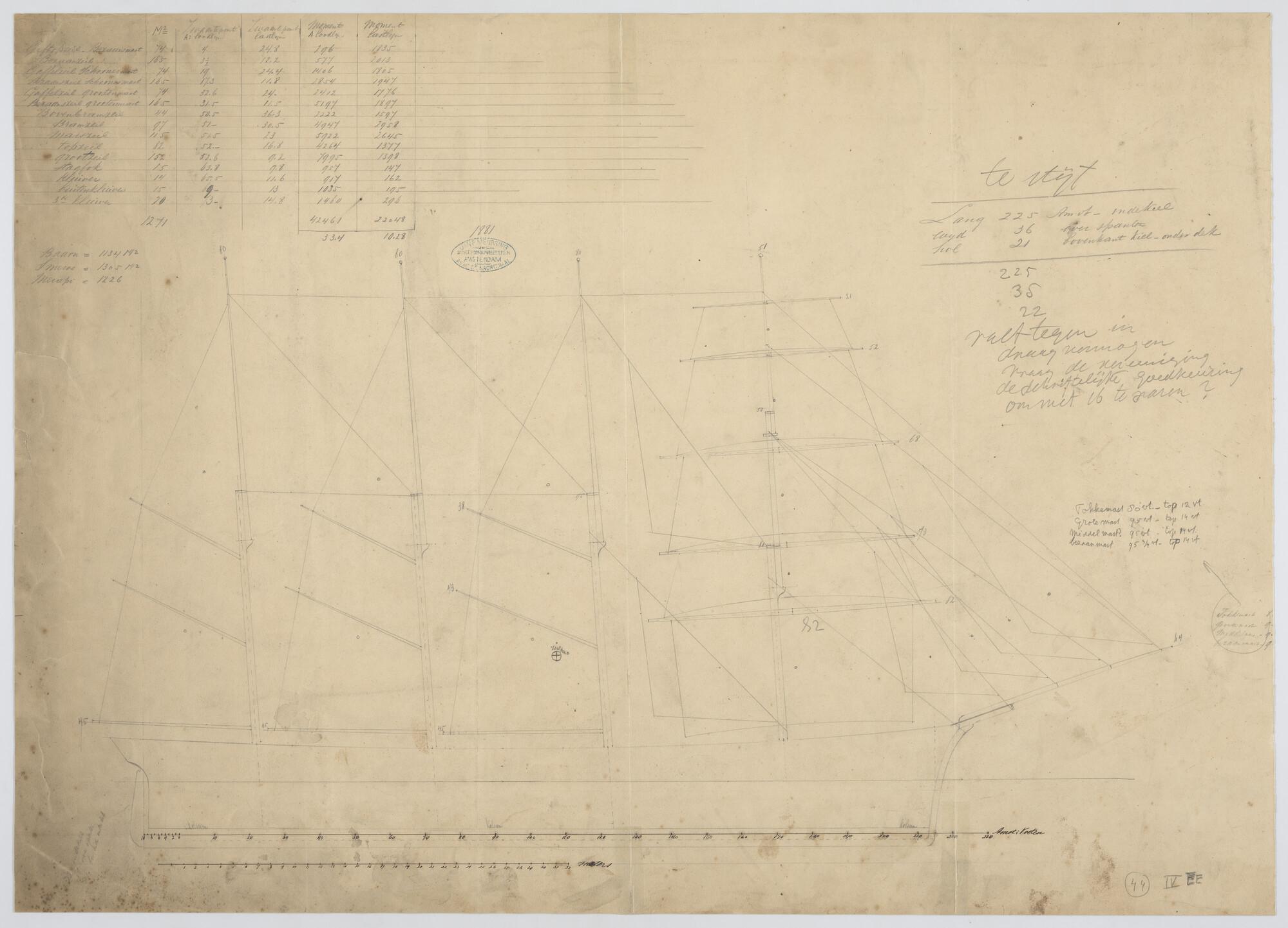Viermastschoener. Tuigtekening met zeilpunt berekening. Afmetingen 225 x 36 x 21 voet.