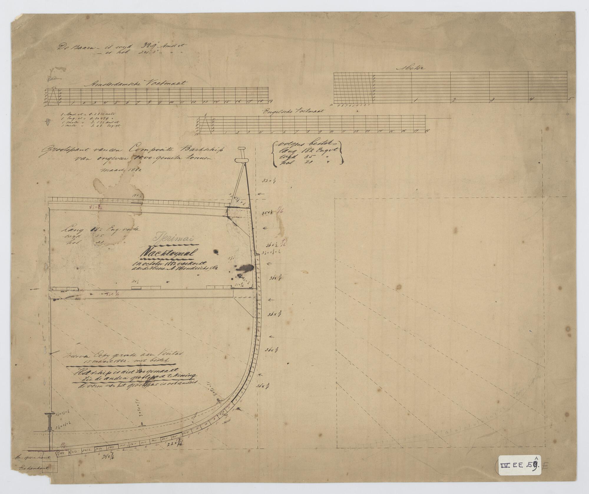 Grootspant met beschrijving bevestiging huidgangen van de klipperbark "Tjerimai" 1882. Afmetingen 189 x 38½ x 24 voet.