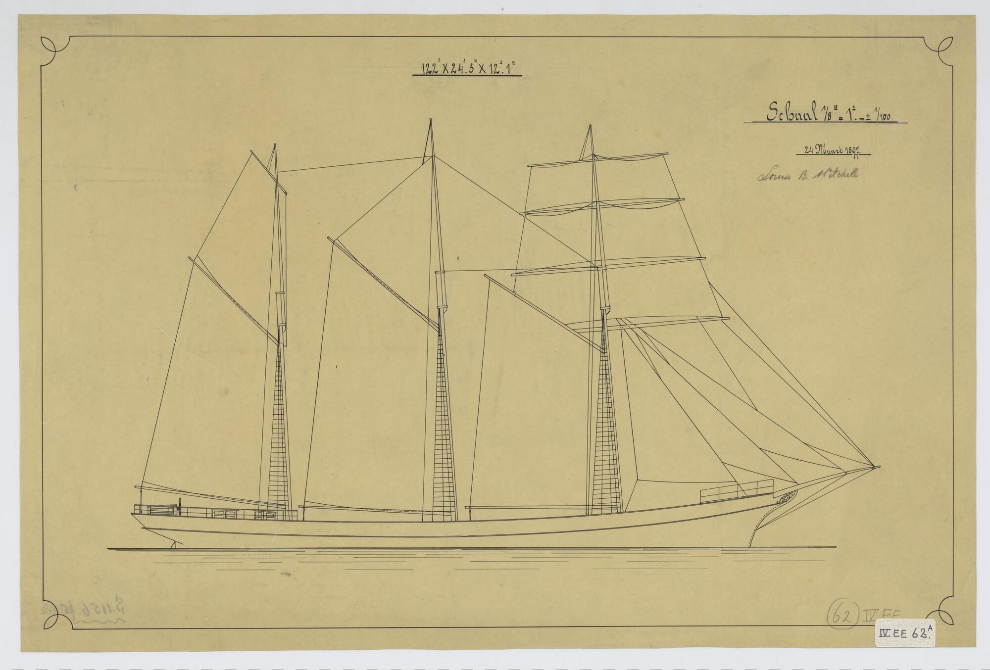 Driemastschoener: Grootspant, tuigplan. Afmetingen 122 x 24.3 x 12.1 voet.