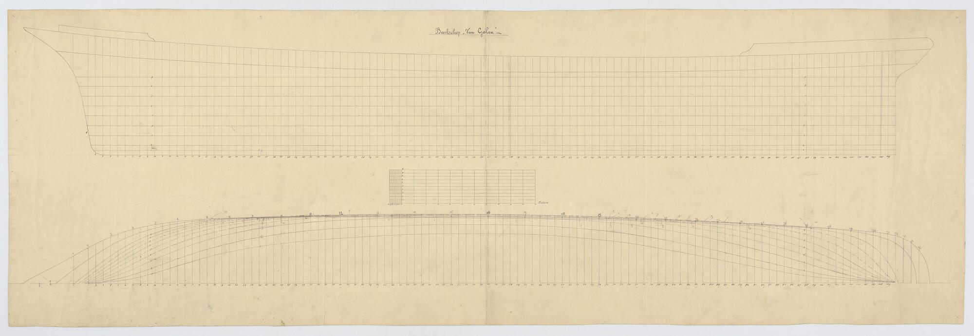 Zijaanzicht, waterlijnen van de klipperbark Van Galen, 222 x 37.3 x 23.8 voet.