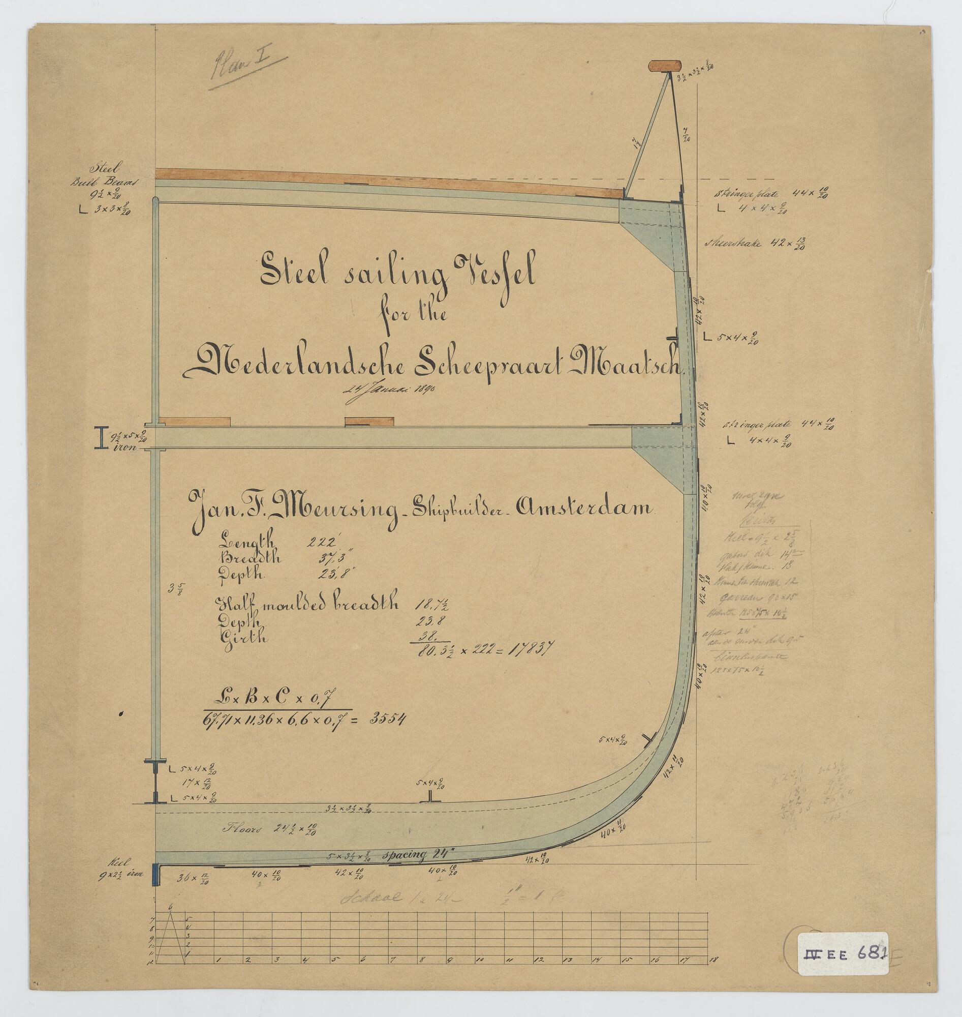Grootspant van de klipperbark Van Galen, 222 x 37.3 x 23.8 voet. Plaat 1.