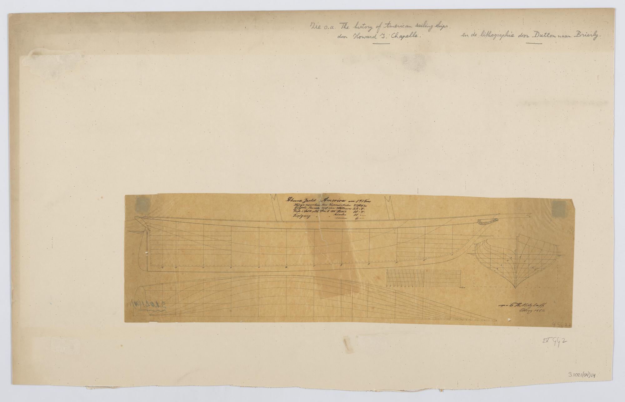 Algemeen plan van het schoenerjacht 'America', afm.: 83.9 x 23.9 x 13.1