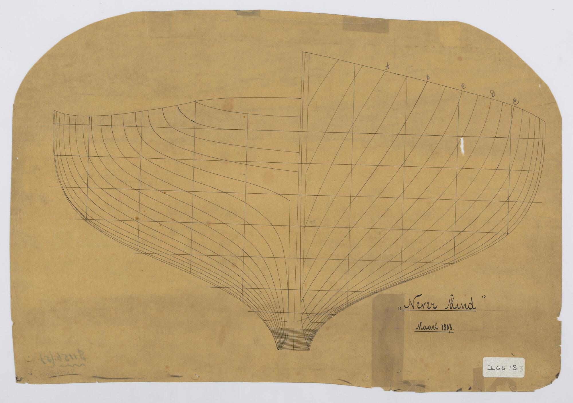 Zijaanzicht en lijnenplan van het Jacht 'Never Mind'