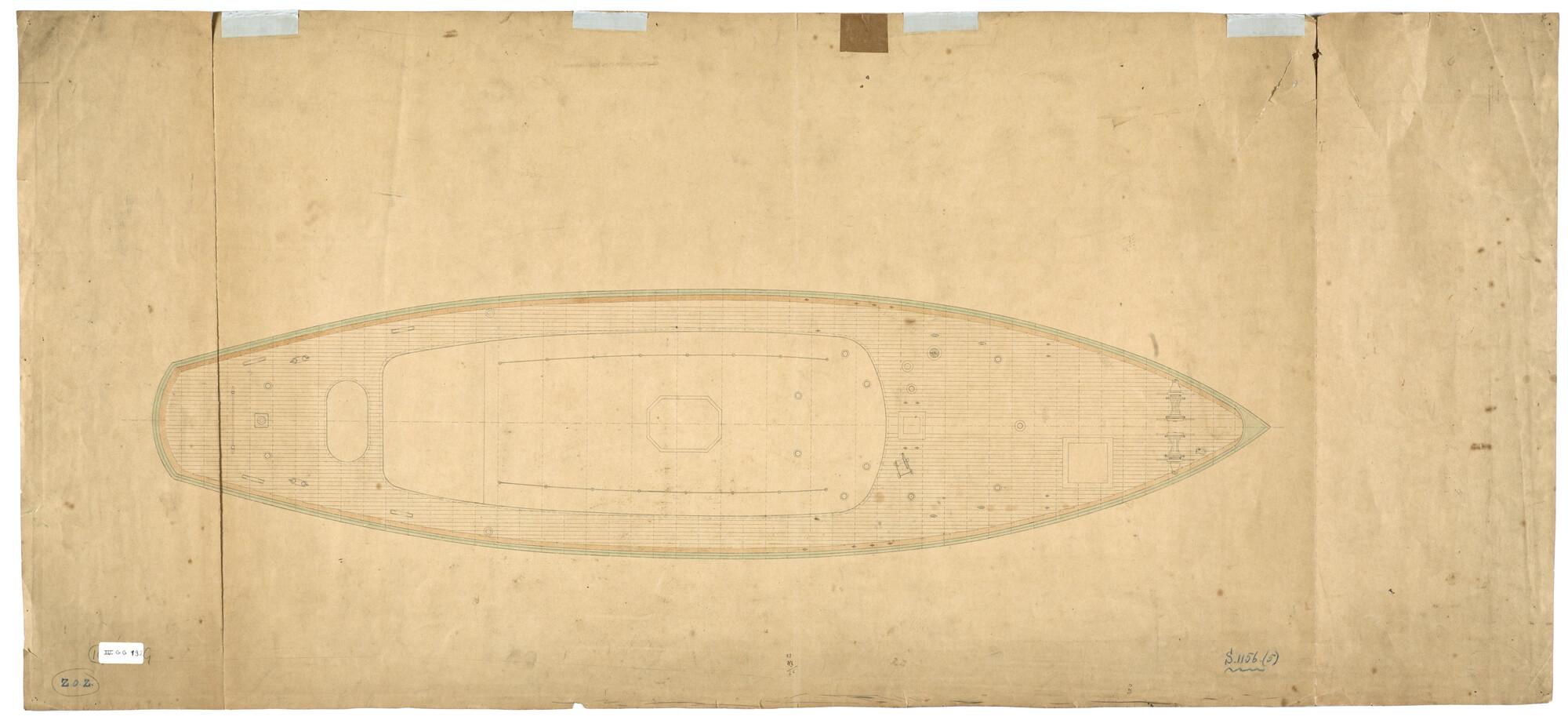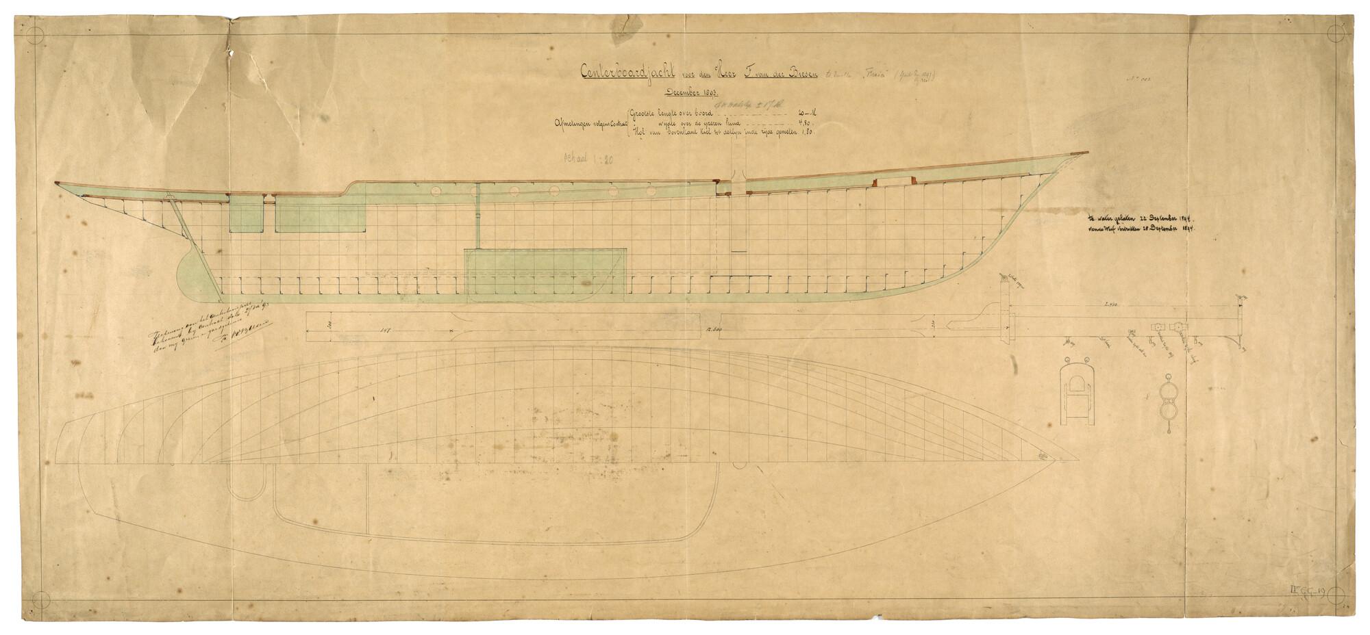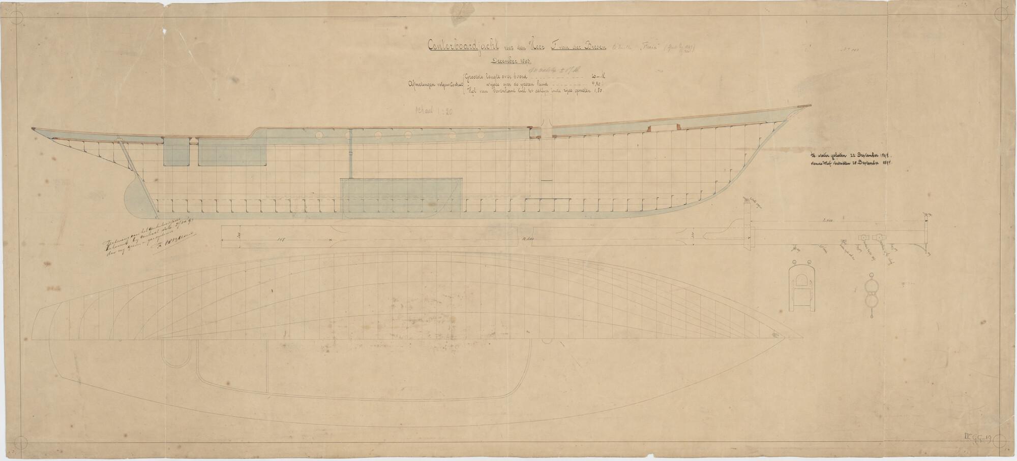 Verticale langsdoorsnede, bovenaanzicht, waterlijnen en mast van het midzwaardjacht "Freia" 1894.