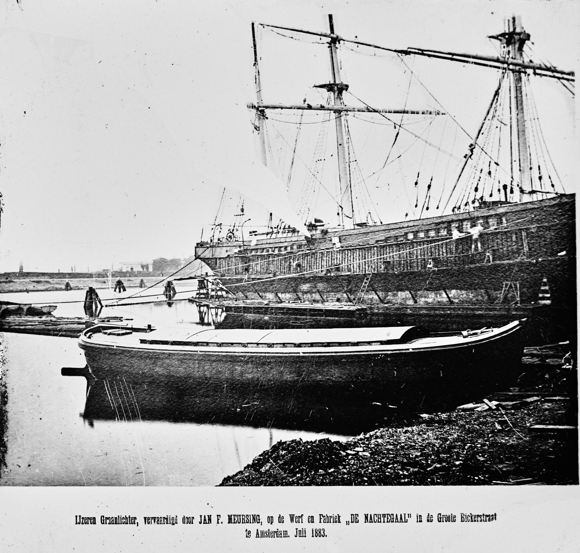 Een ijzeren graanlichter, gebouwd door J. F. Meursing op de werf en fabriek 'De Nachtegaal', in de Groote Bickerstraat te Amsterdam, juli 1883. [Lantaarnplaatje]