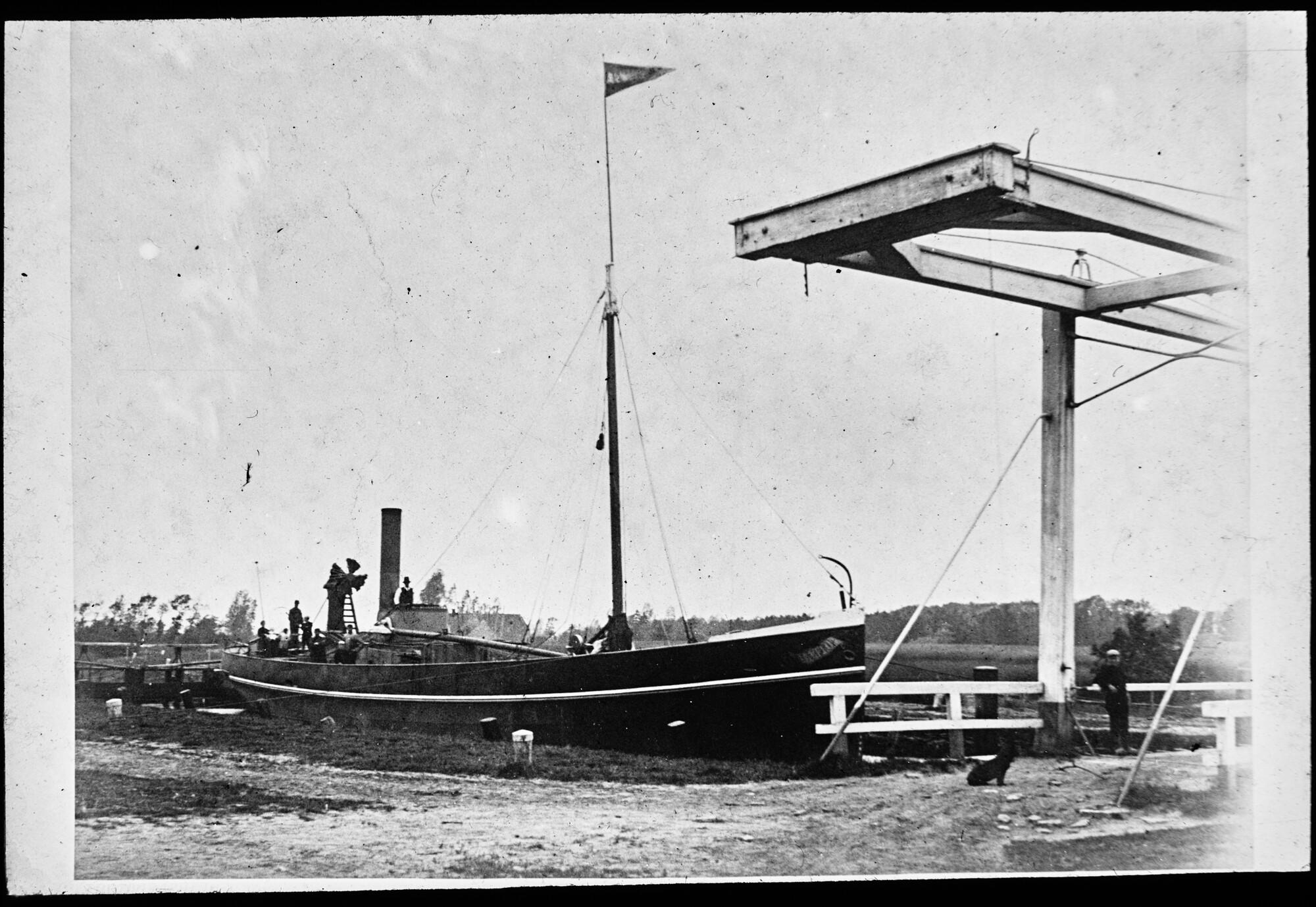 Het vrachtschip ss. "Almelo I" liggend in een sluis bij Almelo, 1891. [Lantaarnplaatje]