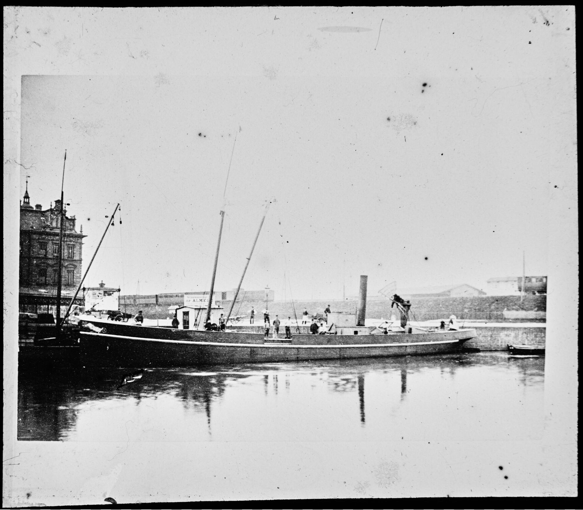 Zijaanzicht van het vrachtschip ss. "Almelo I" afgemeerd aan de steiger van de Stoombootreederij op Almelo bij de Droogbak in Amsterdam, 1891. [Lantaarnplaatje]