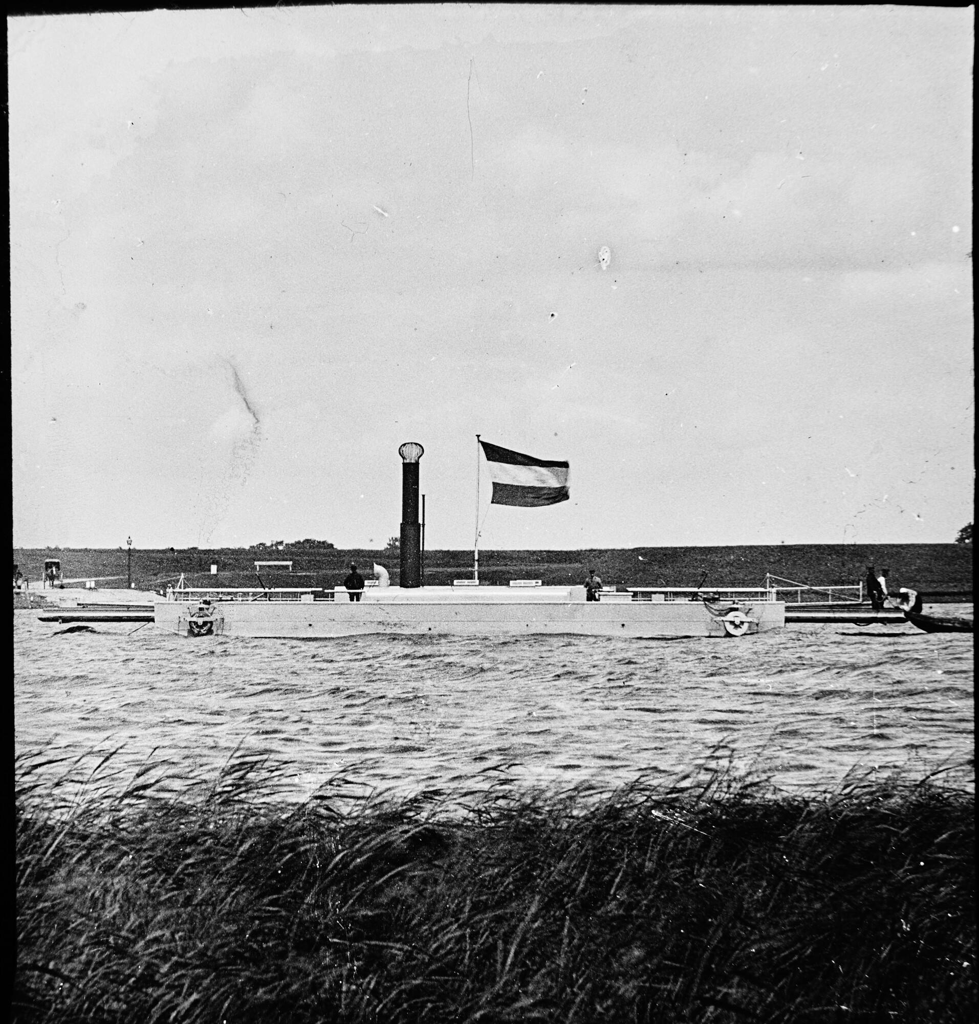 De aankomst van de stoomkabelpont aan het Capelsche Veer, 14 juli 1895. [Lantaarnplaatje]