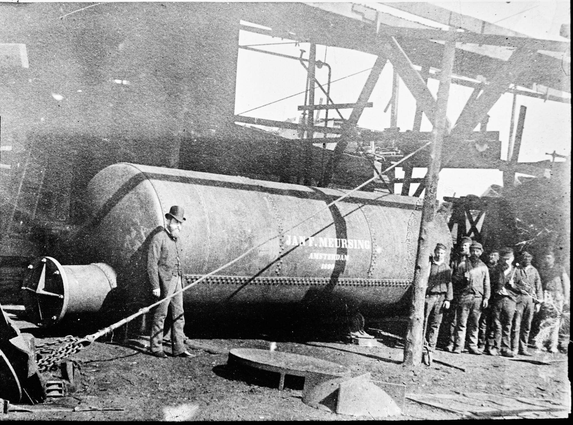 Lantaarnplaatje van een distilleerketel in aanbouw op de werf De Nachtegaal met een groep arbeiders en de heer W.A. Hes poserend voor de ketel, 1890.