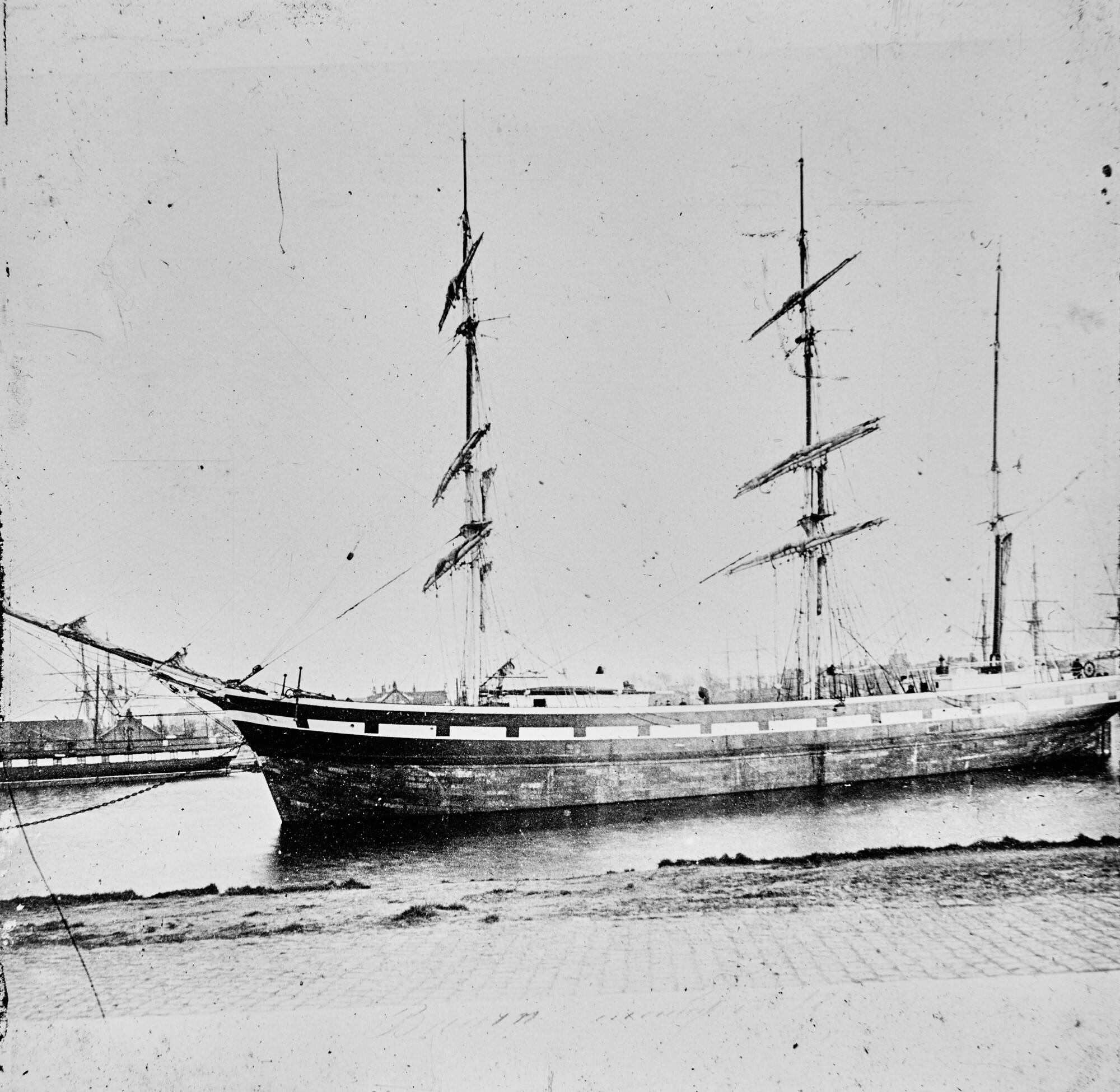 De driemast houten bark 'Baarn', gebouwd op de werf 'De Nachtegaal' in 1879, ligt afgemeerd te Amsterdam