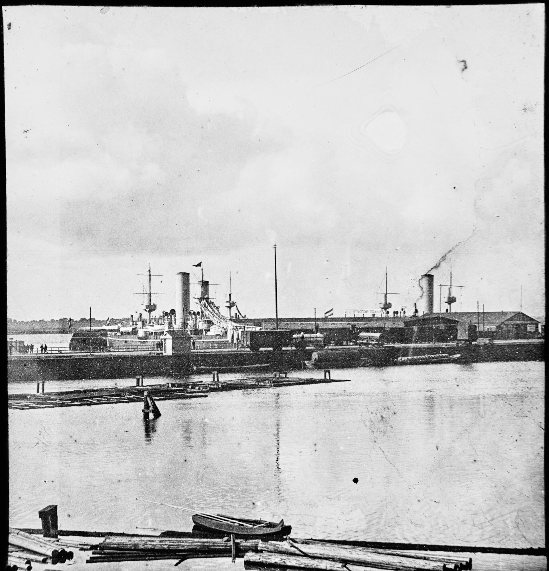 Twee Nederlandse oorlogsschepen van het type Evertsen liggen afgemeerd in de haven van Amsterdam. [Lantaarnplaatje]