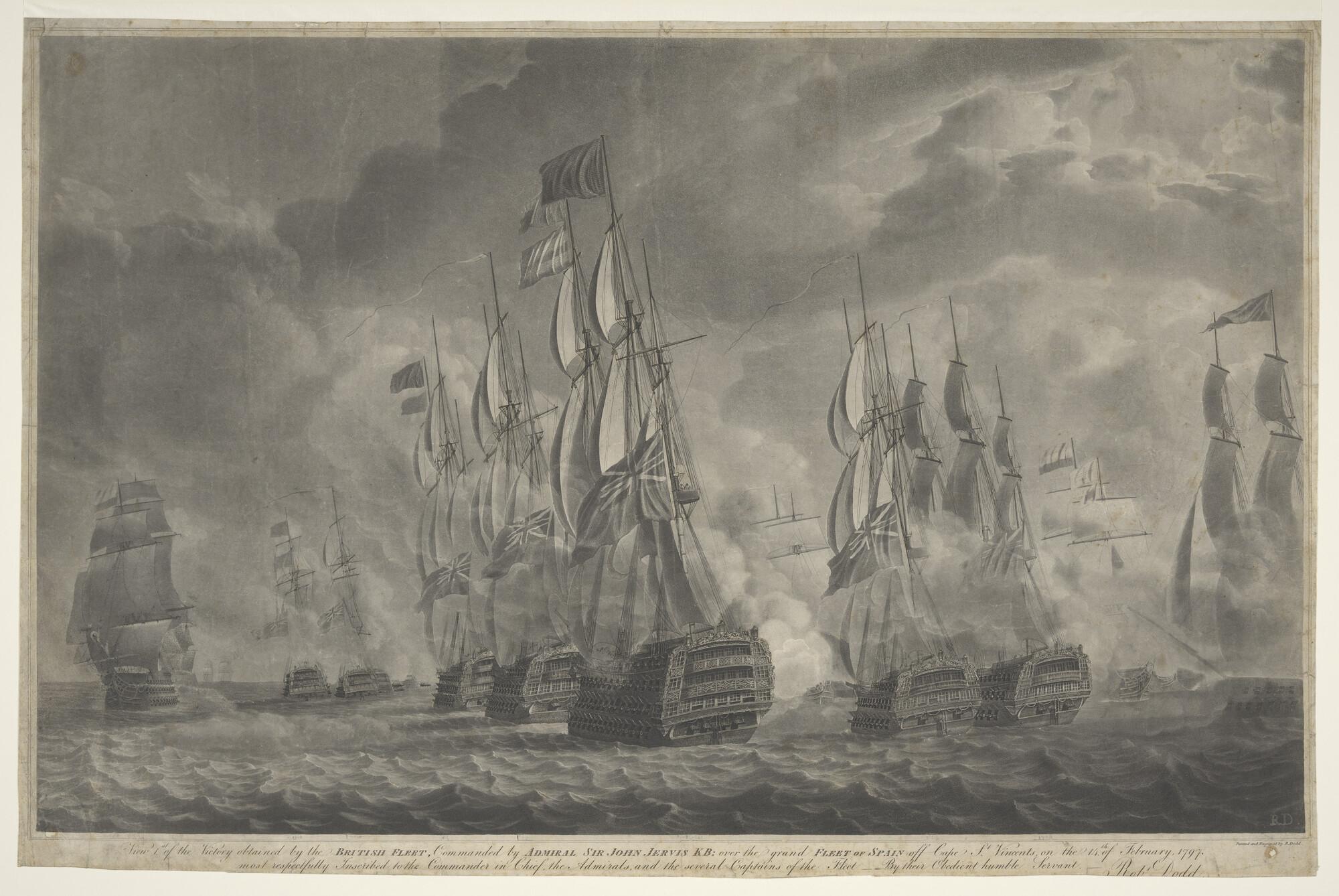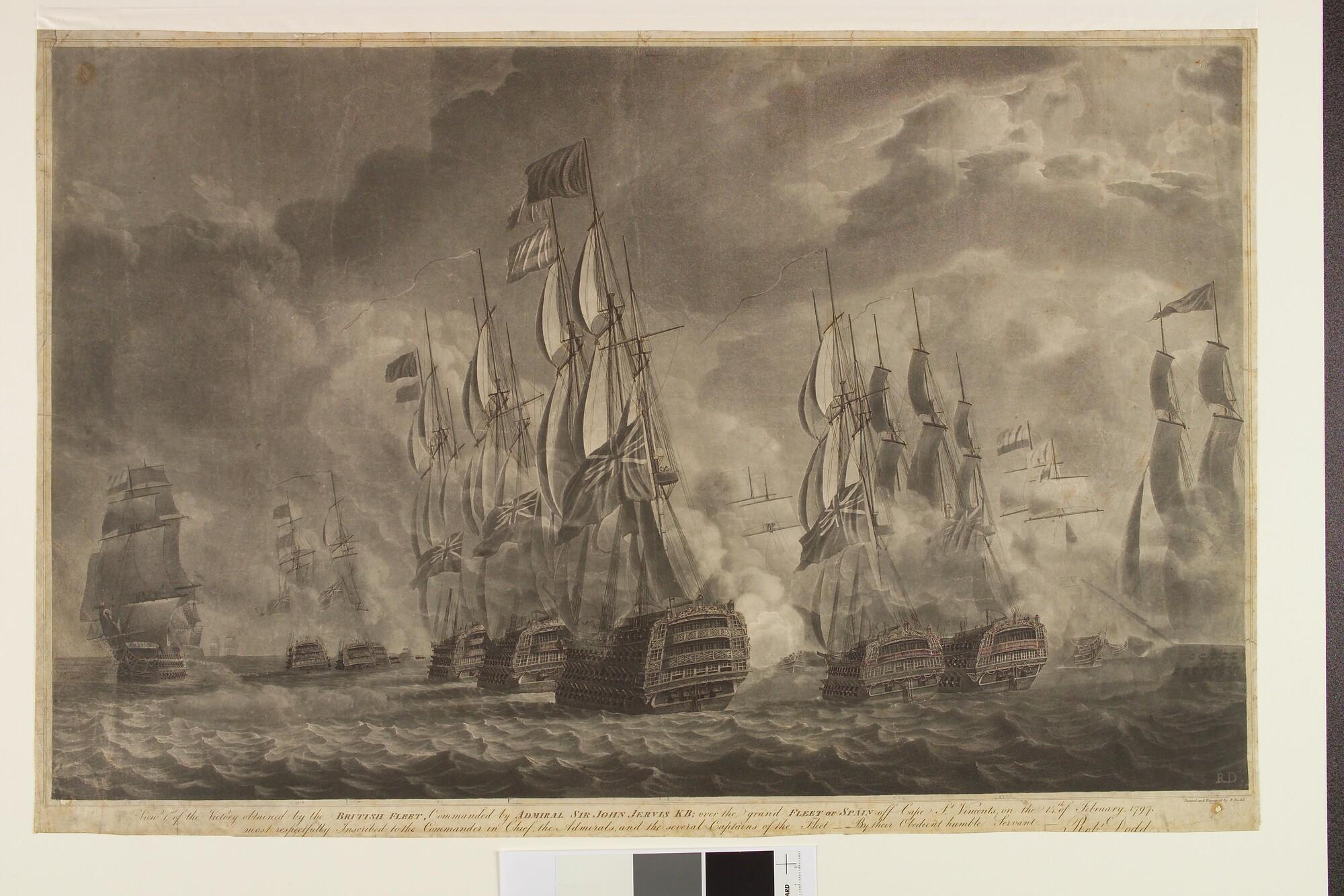 'View 1st of the Victory obtained by the British Fleet'. Eerste gezicht op de overwinning van de Engelse vloot op de Spaanse vloot op de rede van Kaap St. Vincent, 14 februari 1797.