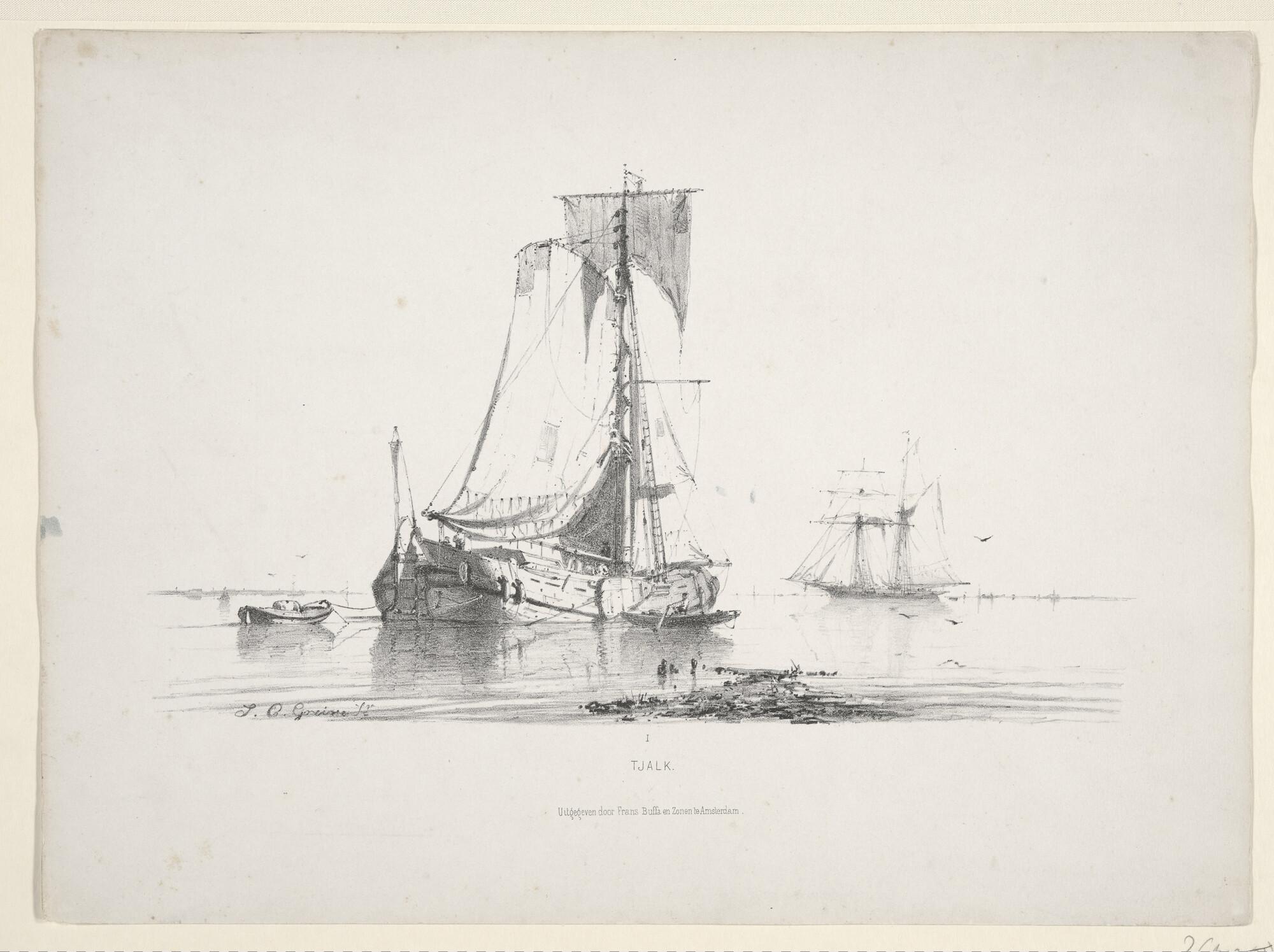 Prentserie 'Studien van Hollandsche Schepen', nummer 1: een tjalk voor anker op stil water