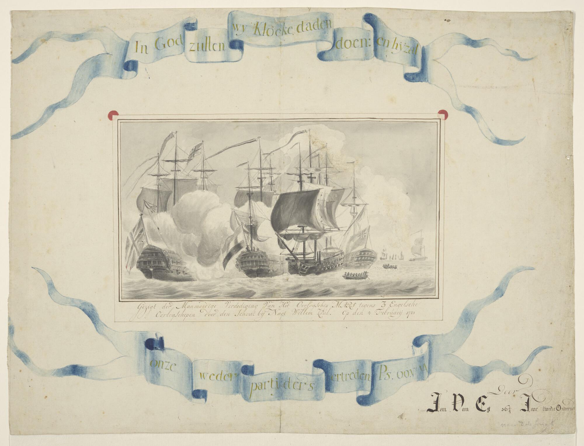 Het oorlogsschip 'Mars' onder commando van de Schout-bij-Nacht Willem Krul in gevecht met Engelse oorlogsschepen
