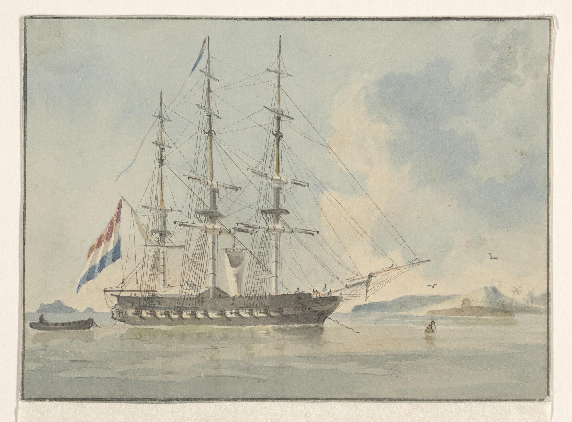 Een oorlogsfregat voor anker liggend.