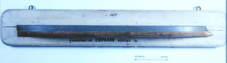 Halfmodel (schaal 1:40) van de rammonitor Zr.Ms. Luipaard, gebouwd op de werf Feijenoord te Rotterdam in 1875.