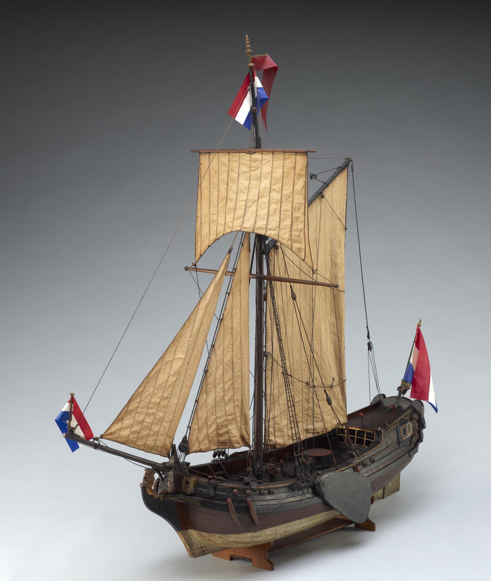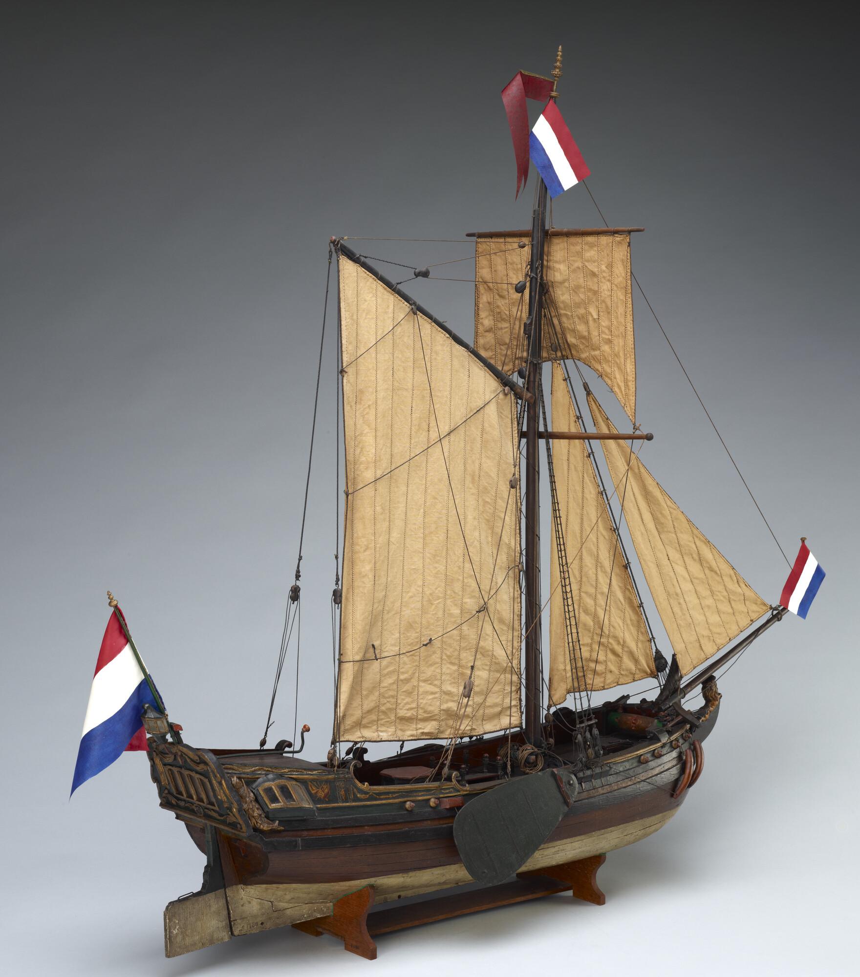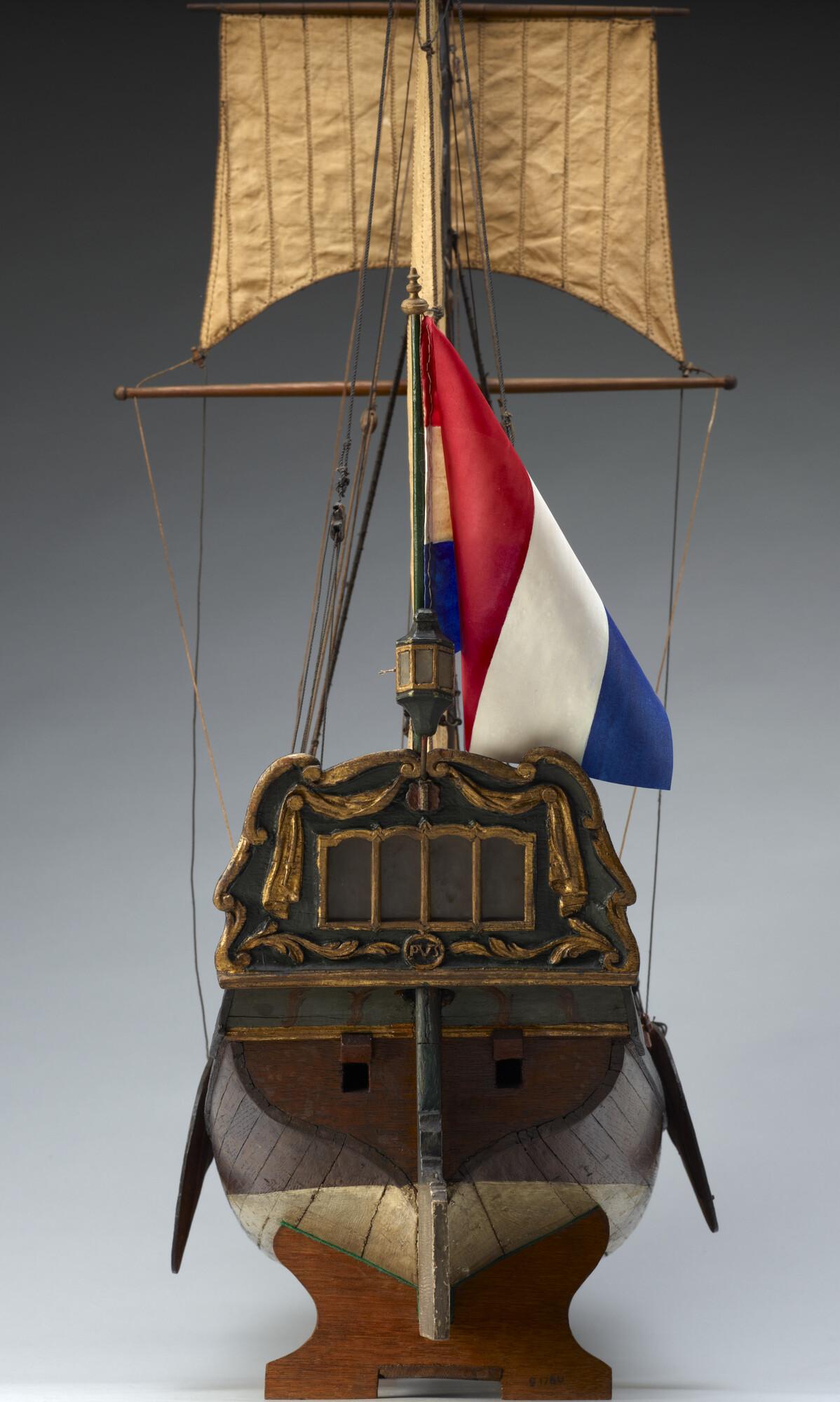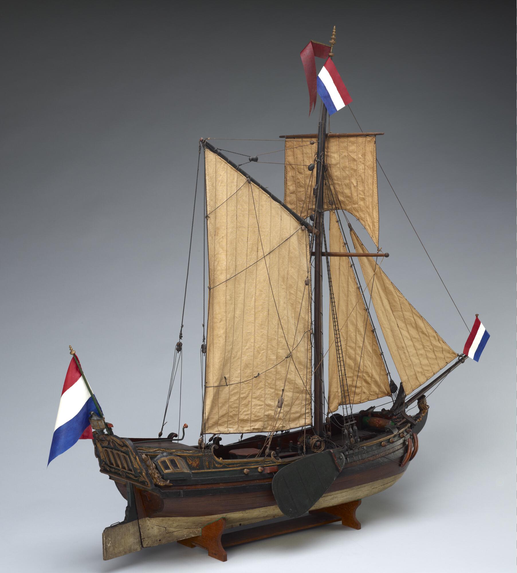 Op spanten gebouwd getuigd model van een spiegeljacht met paviljoen, laatste kwart achttiende eeuw. Op de spiegel het wapen van Amsterdam met drie andreaskruisen boven elkaar op een rode ondergrond en de initialen PVS. In de kielbalk zitten zes gaten, waaraan mogelijk een loden kiel kon worden bevestigd om met het model te kunnen zeilen. ...
