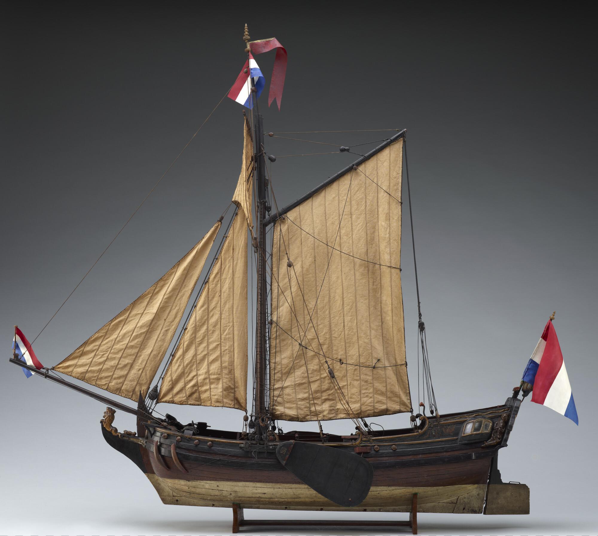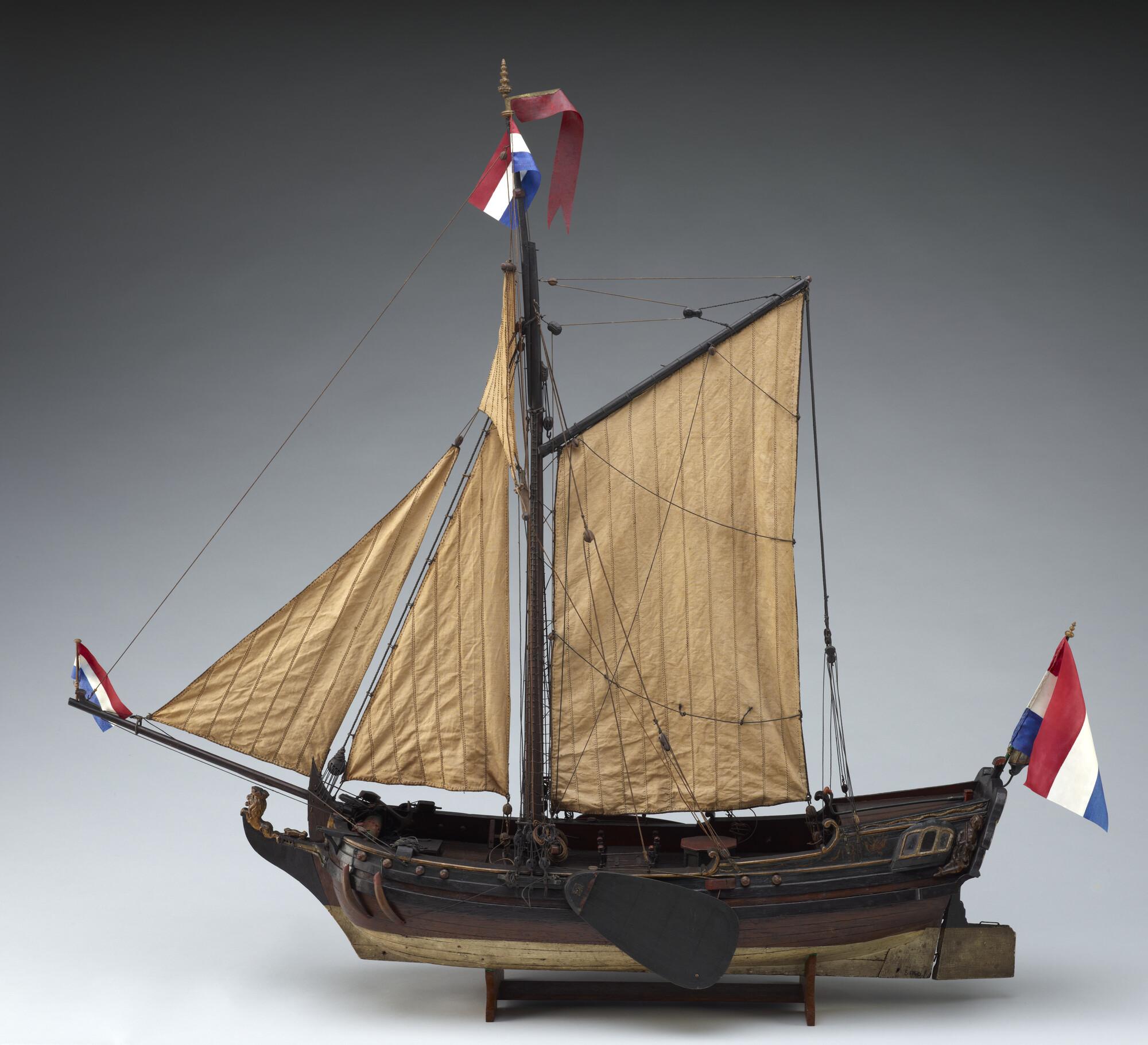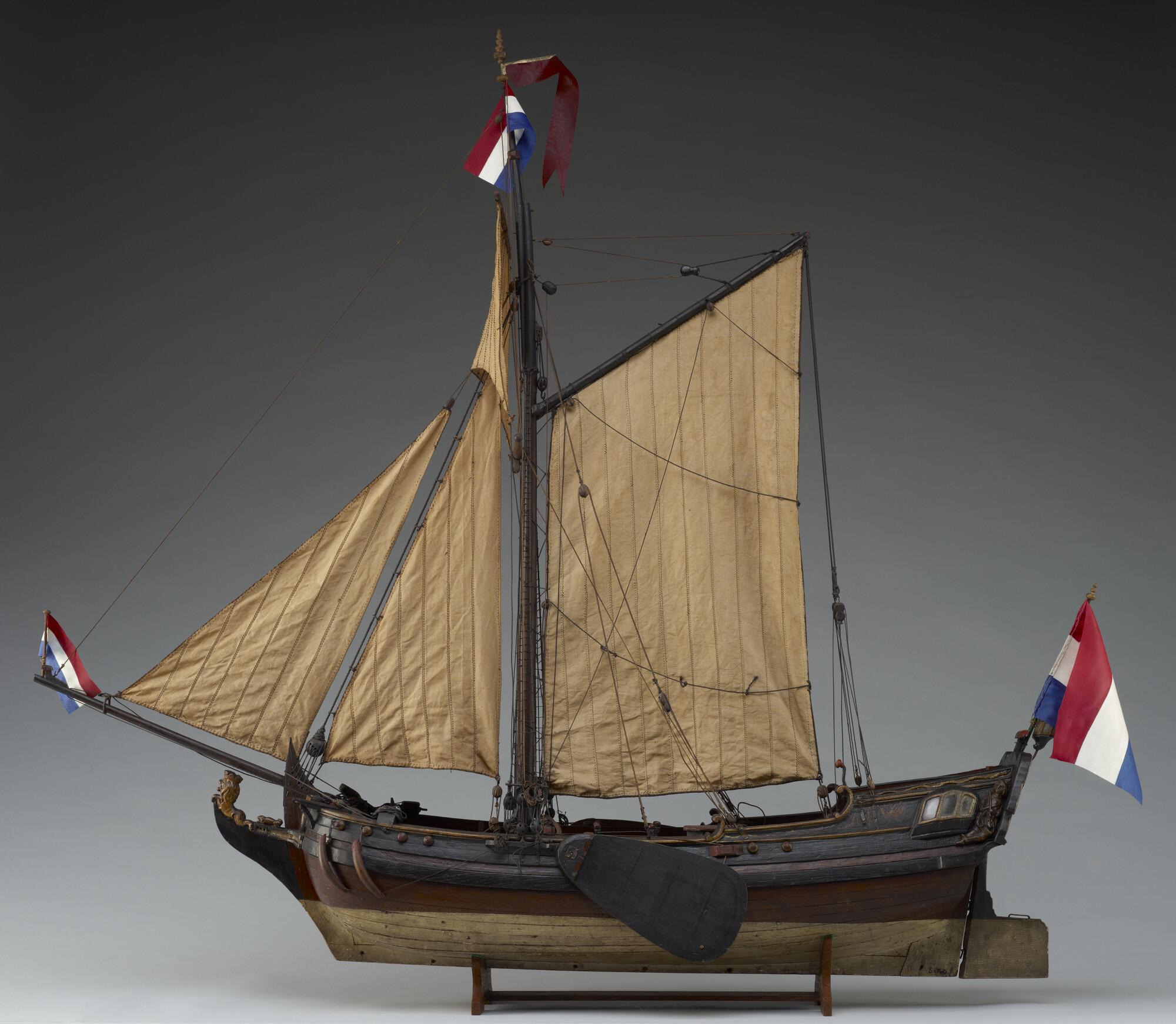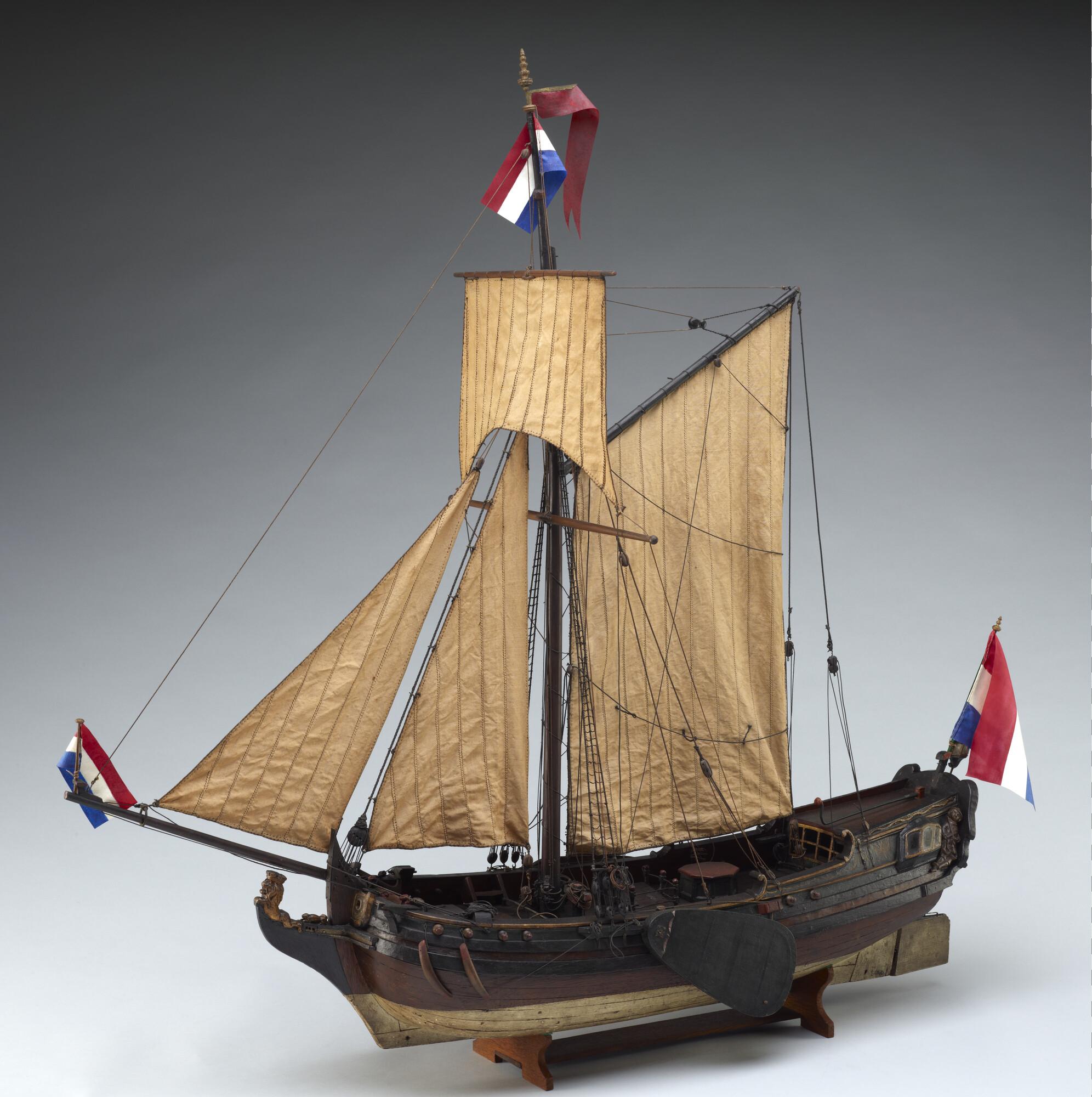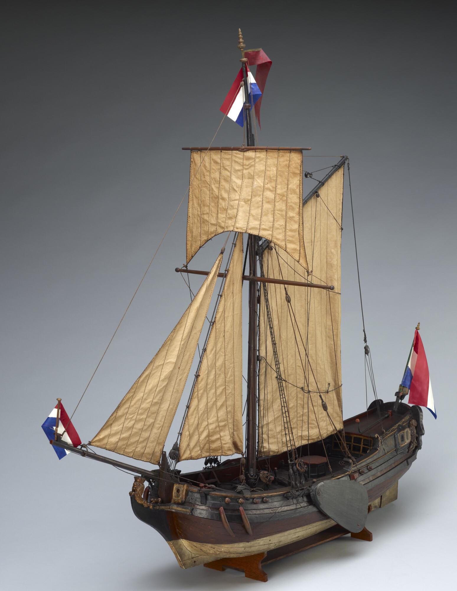 Op spanten gebouwd getuigd model van een spiegeljacht met paviljoen, laatste kwart achttiende eeuw. Op de spiegel het wapen van Amsterdam met drie andreaskruisen boven elkaar op een rode ondergrond en de initialen PVS. In de kielbalk zitten zes gaten, waaraan mogelijk een loden kiel kon worden bevestigd om met het model te kunnen zeilen. ...