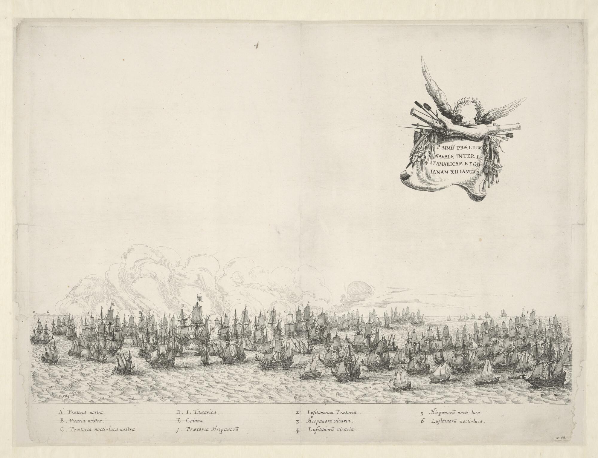 De terugkeer van de vloot van Johan Maurits uit Brazilië naar Nederland, 1642, uitgegeven als illustratie in het boek van C. Barlaeus 'Rerum per octennium in Brasilia'. Amsterdam : Joan Blaeu, 1647.