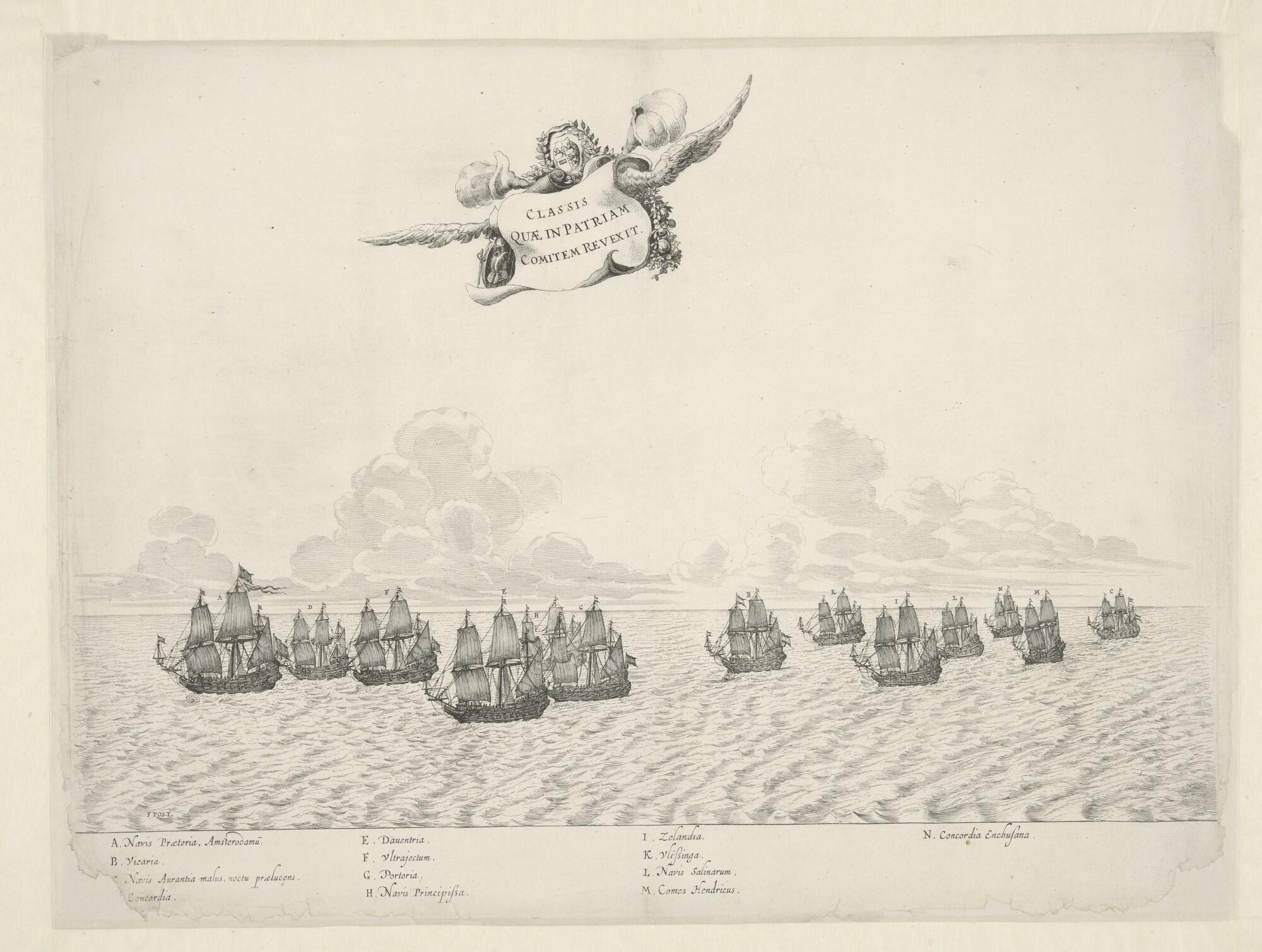Vierdaagse zeeslag van de vloot Johan Maurits van Nassau en de Portugezen: 3de dag, gevecht bij Pariba, 14 januari 1640, uitgegeven als illustratie in het boek van C. Barlaeus 'Rerum per octennium in Brasilia'. Amsterdam : Joan Blaeu, 1647.