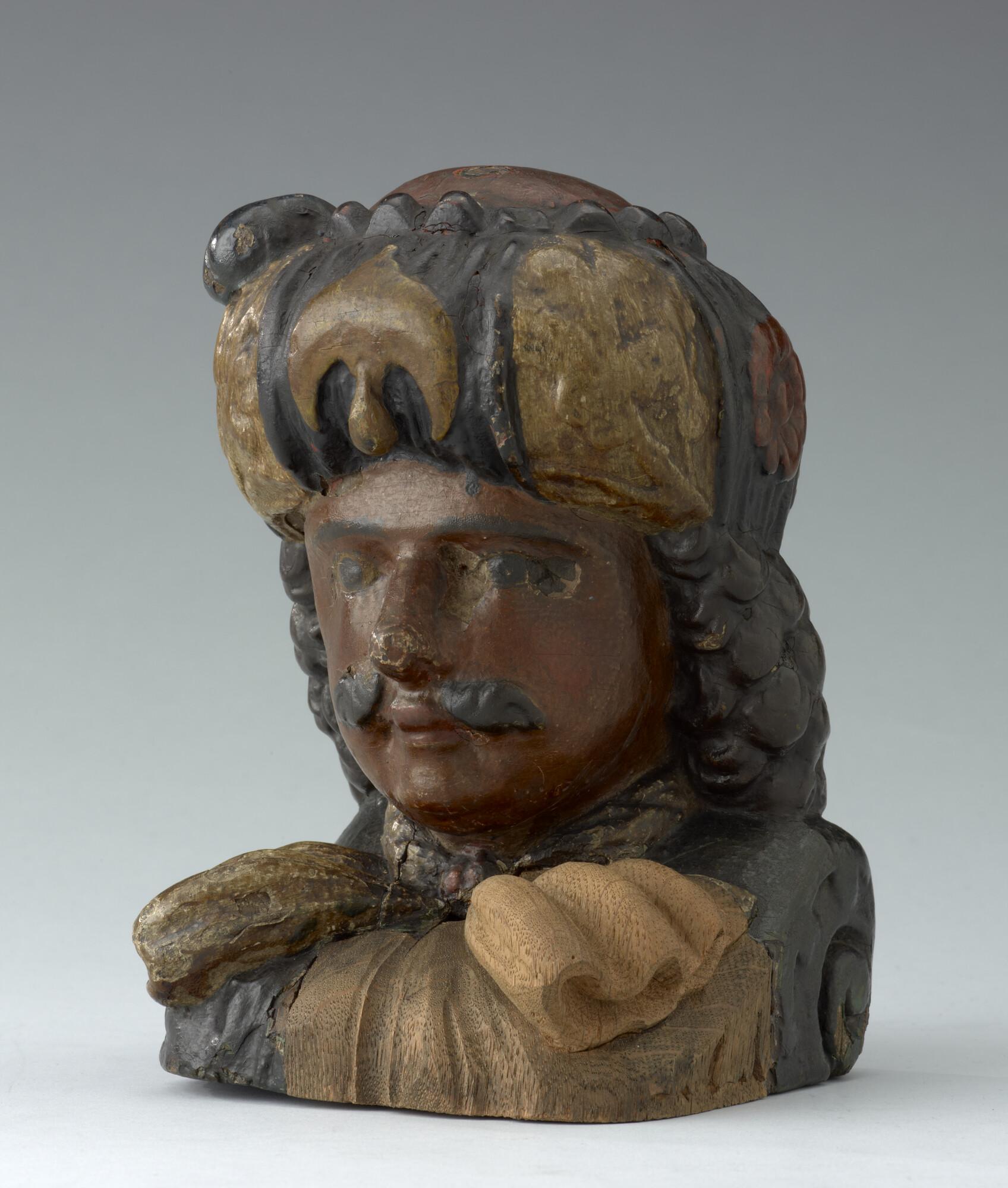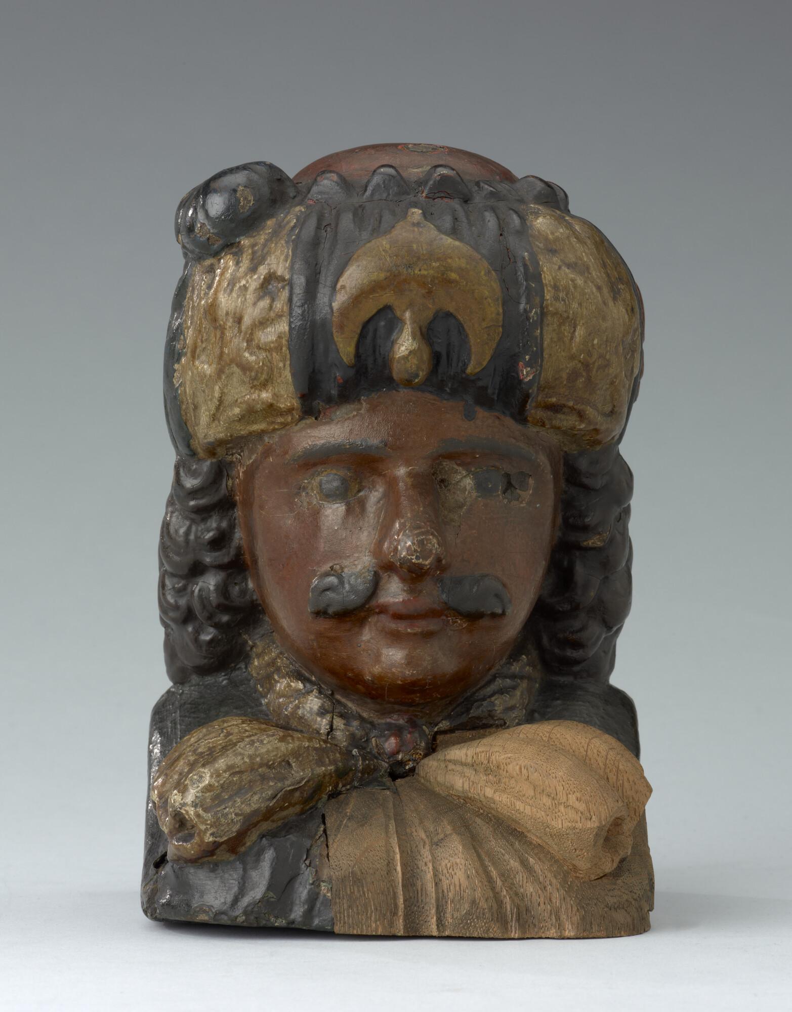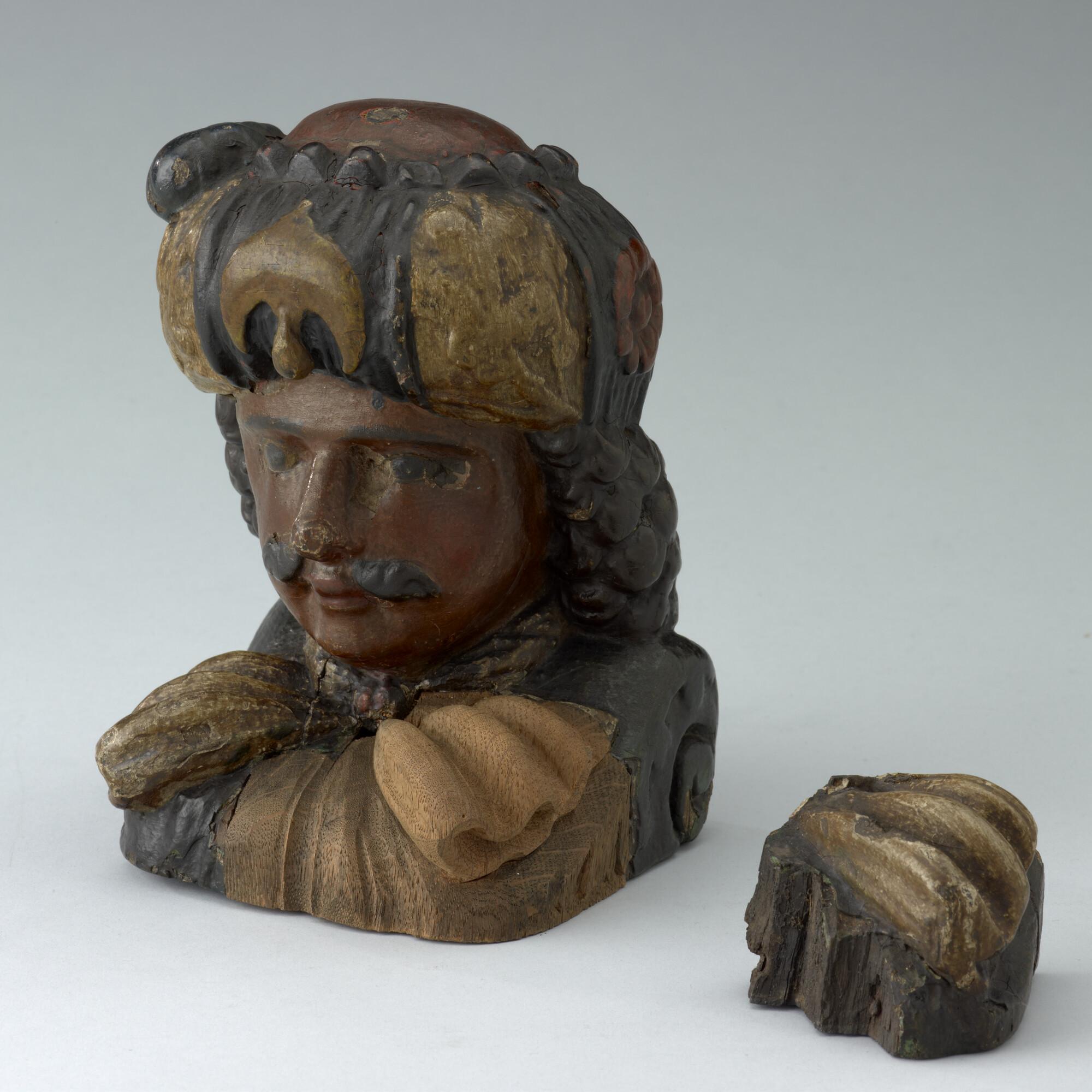 Stevenstuk in de vorm van een mannenhoofd getooid met een tulband, een z.g. 'Moor'. Origineel stuk van de kraag is ooit verwijderd en vervangen.