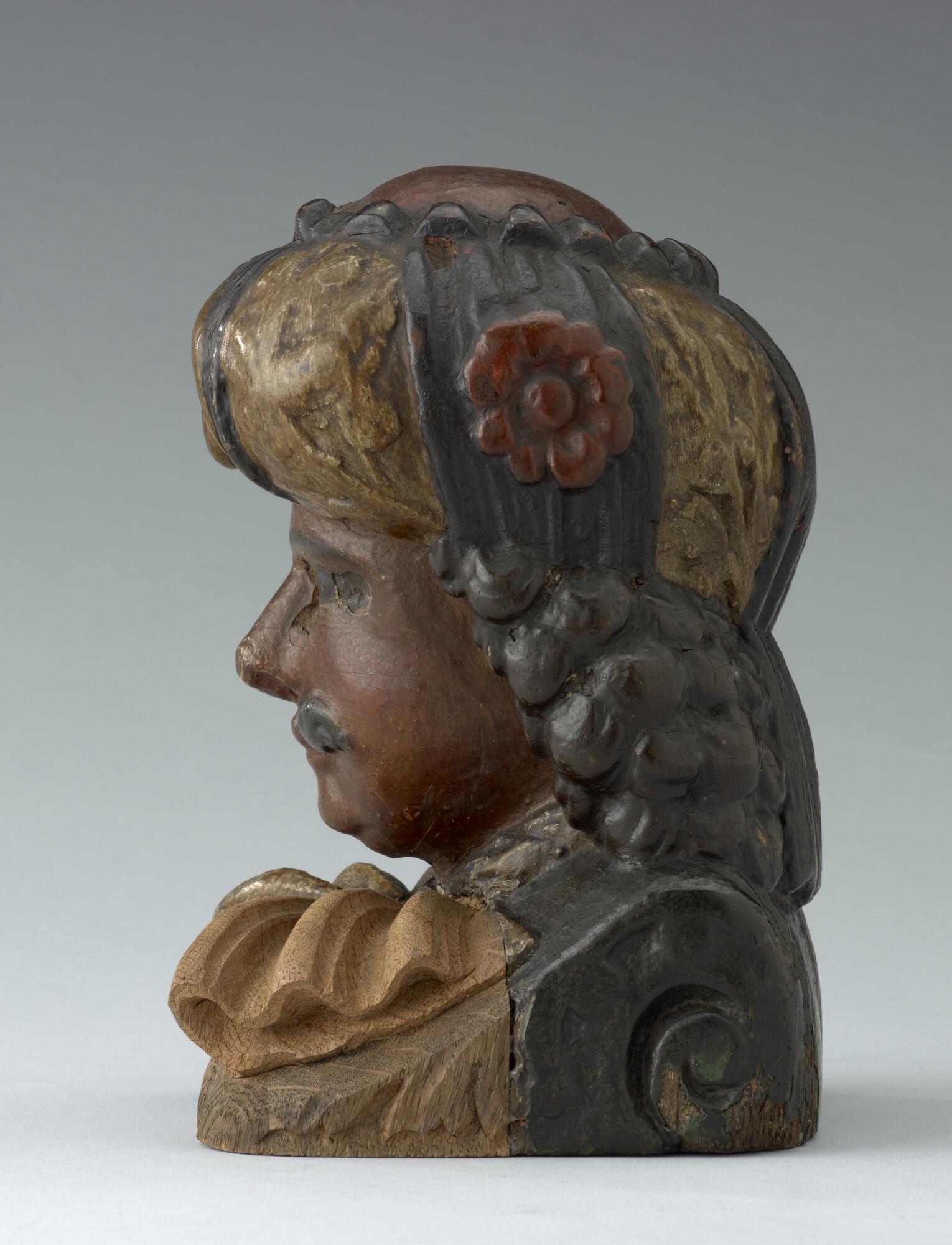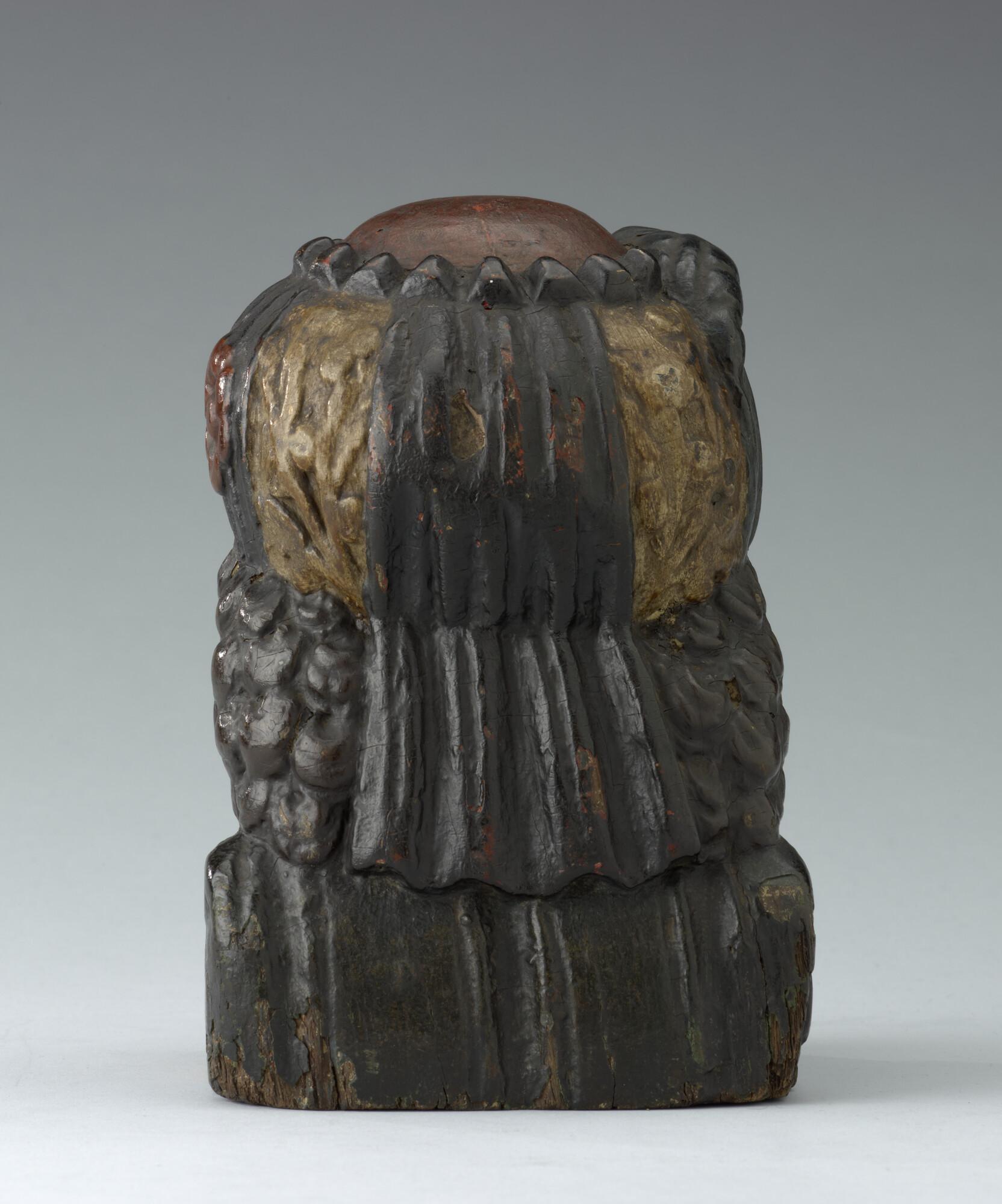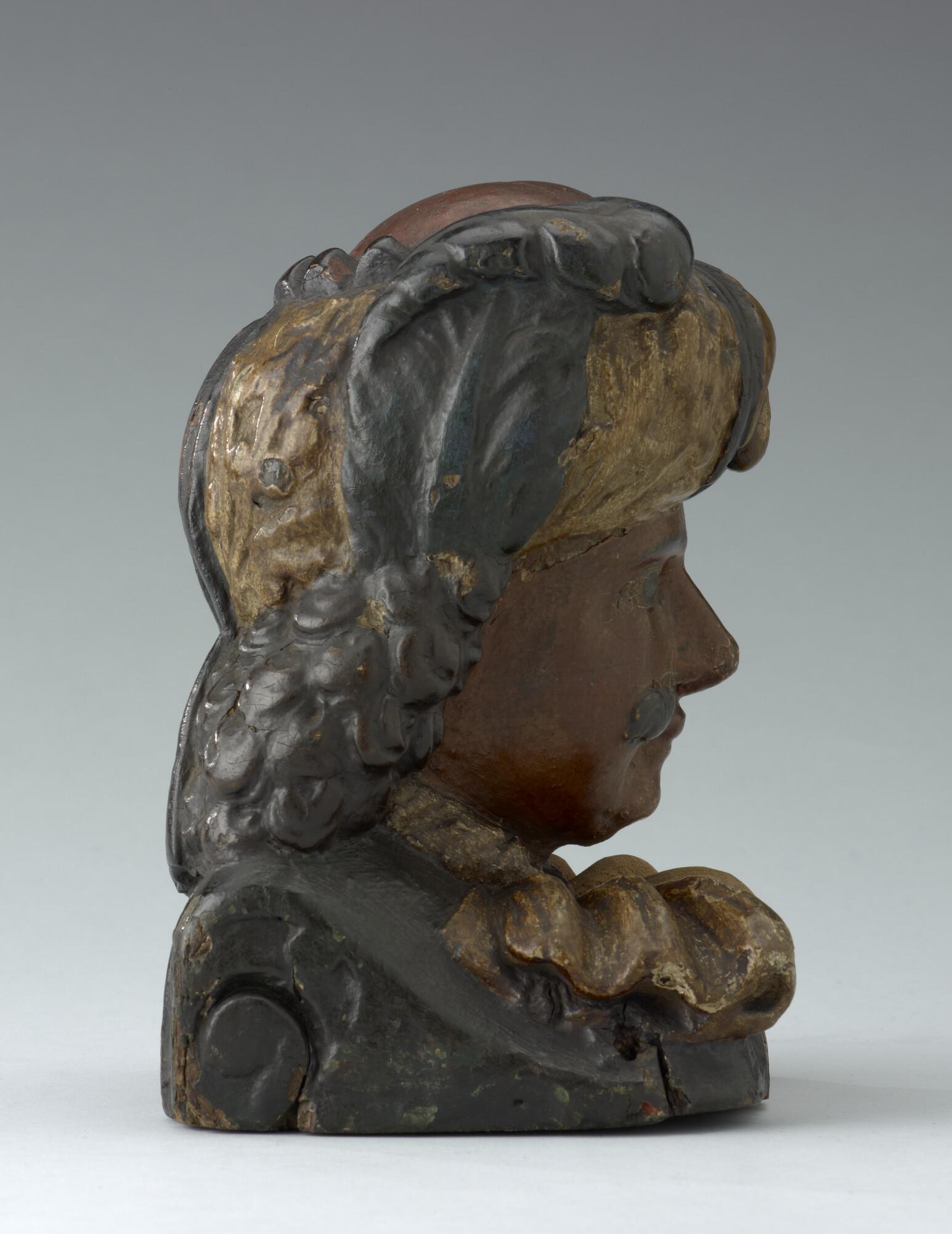 Stevenstuk in de vorm van een mannenhoofd getooid met een tulband, een z.g. 'Moor'. Origineel stuk van de kraag is ooit verwijderd en vervangen.