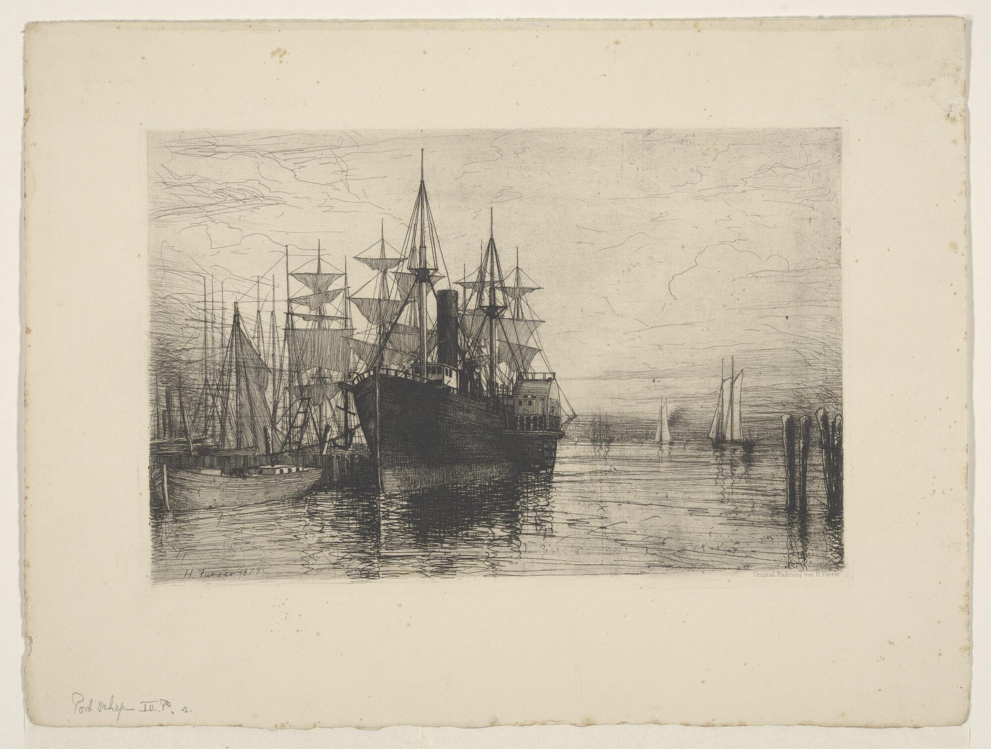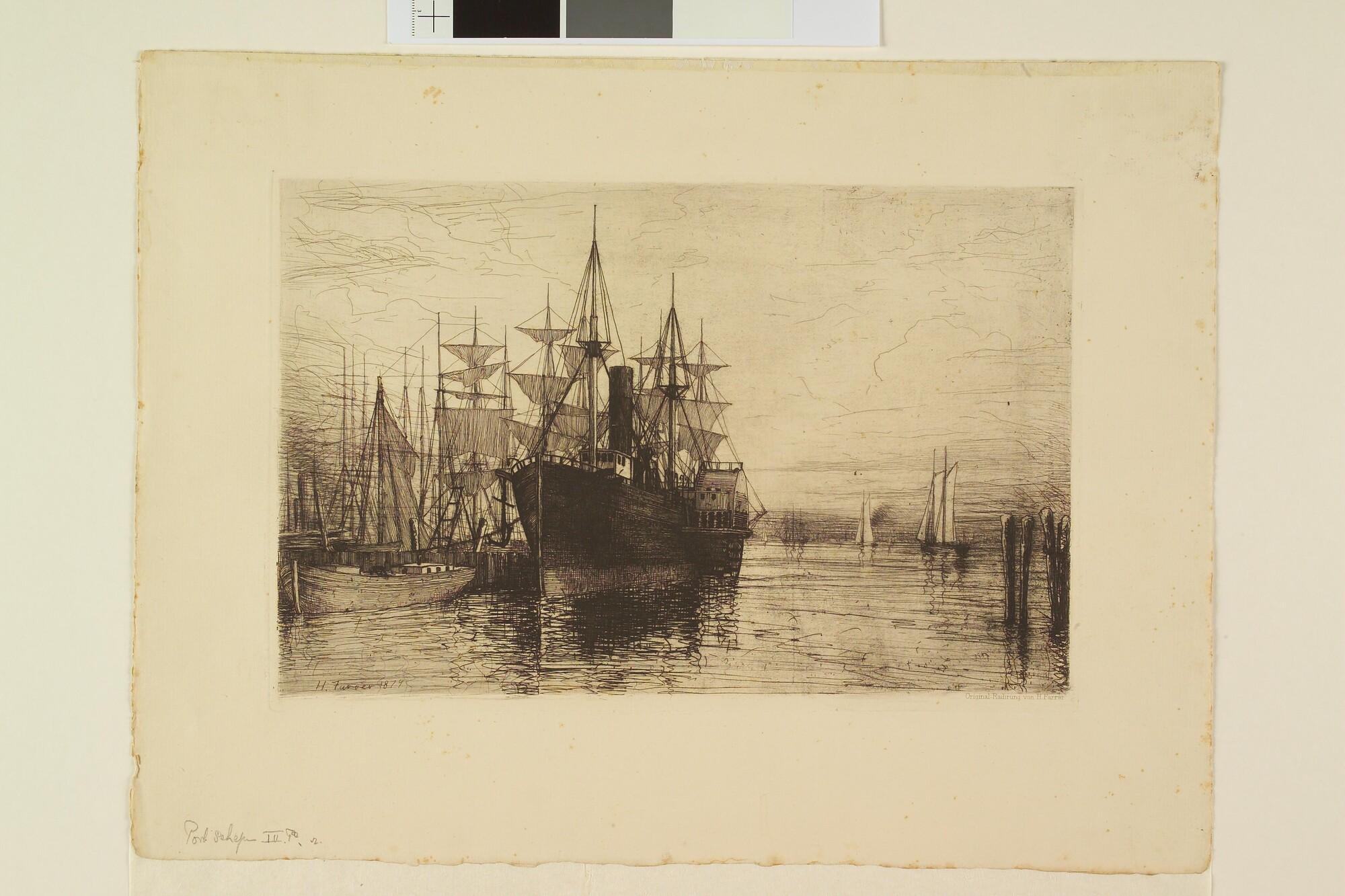 Havengezicht met op de voorgrond een driemastraderstoomschip.