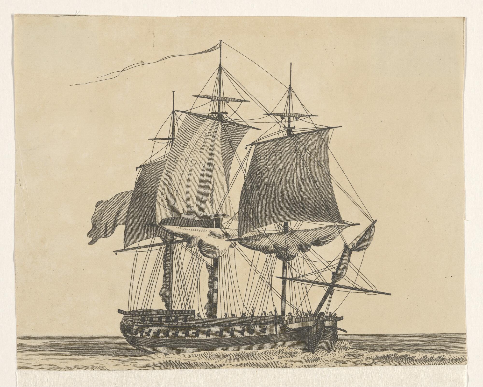 Oorlogsschip van 40 stukken onder zeil, gezien van stuurboord dwars