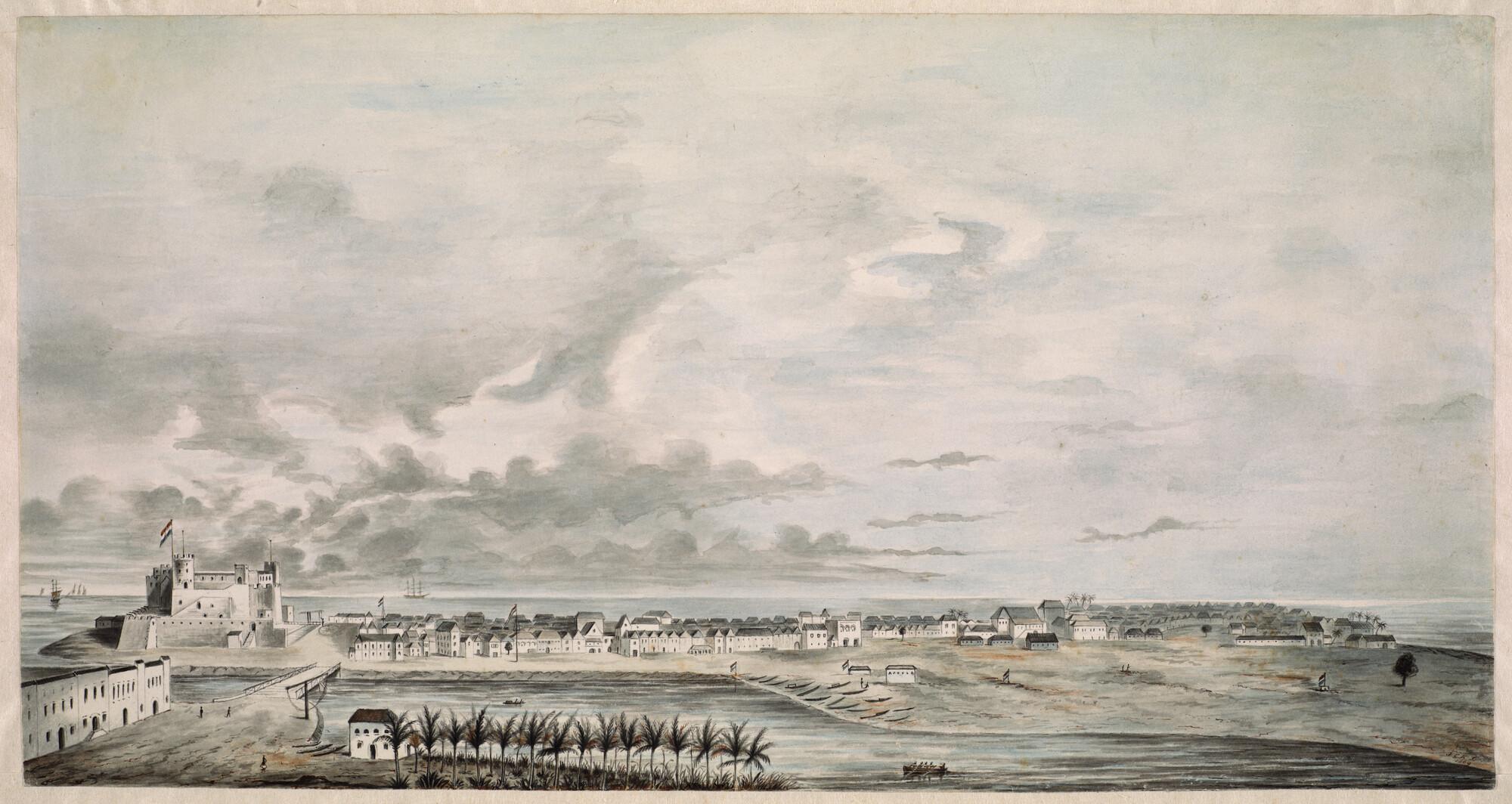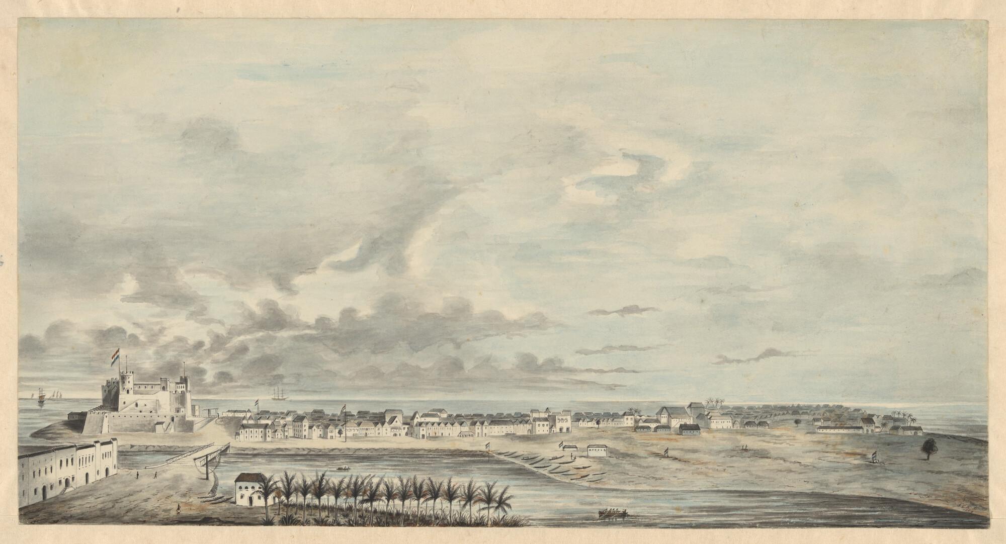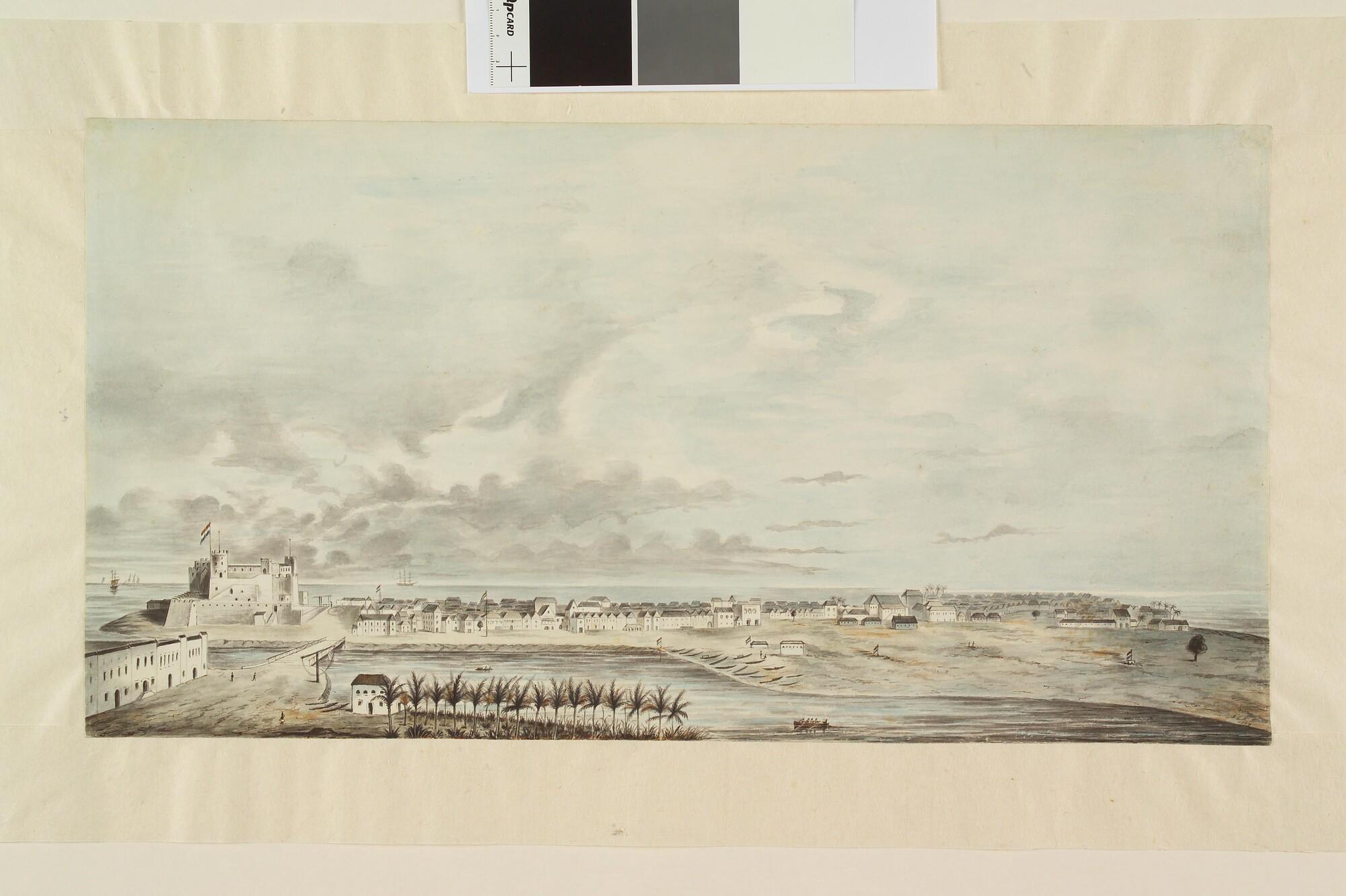 Gezicht op het kasteel St. George d'Elmina aan de Goudkust; rechts het stadje Elmina.
