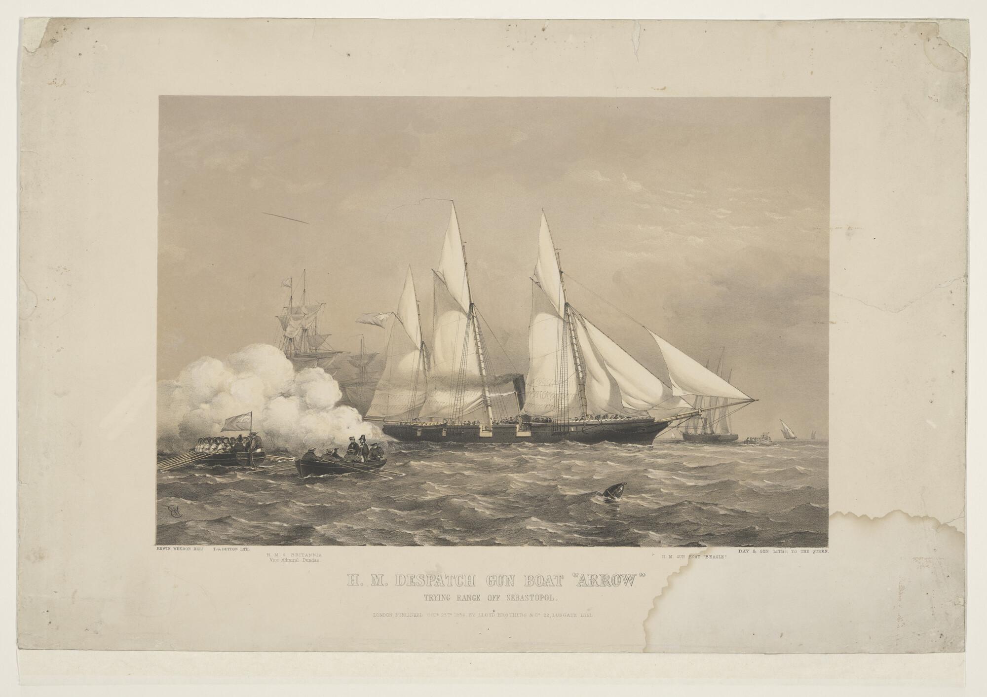 De Britse stoomkanonneerboot HMS "Arrow", tijdens schietoefeningen bij Sebastopol.