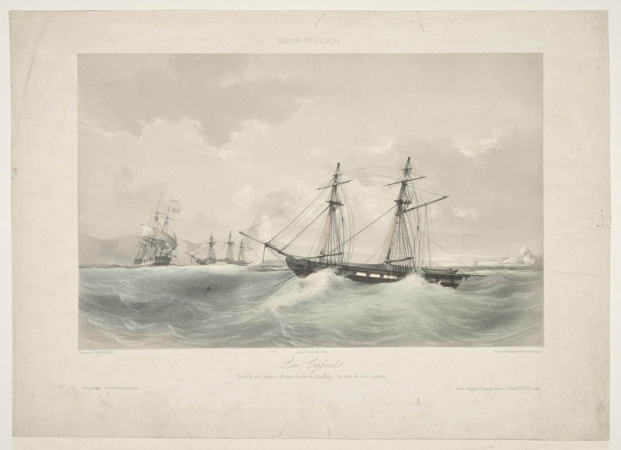 De Franse brik 'Le Cassard' in stormweer voor anker