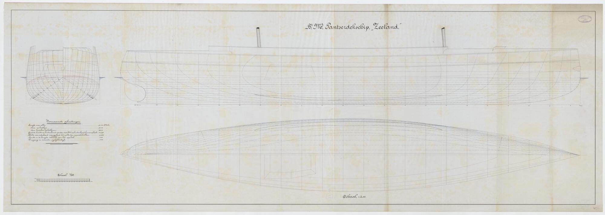 Lijnenplan en spantenraam van het pantserdekschip Hr.Ms. "Zeeland" (schaal 1:50).