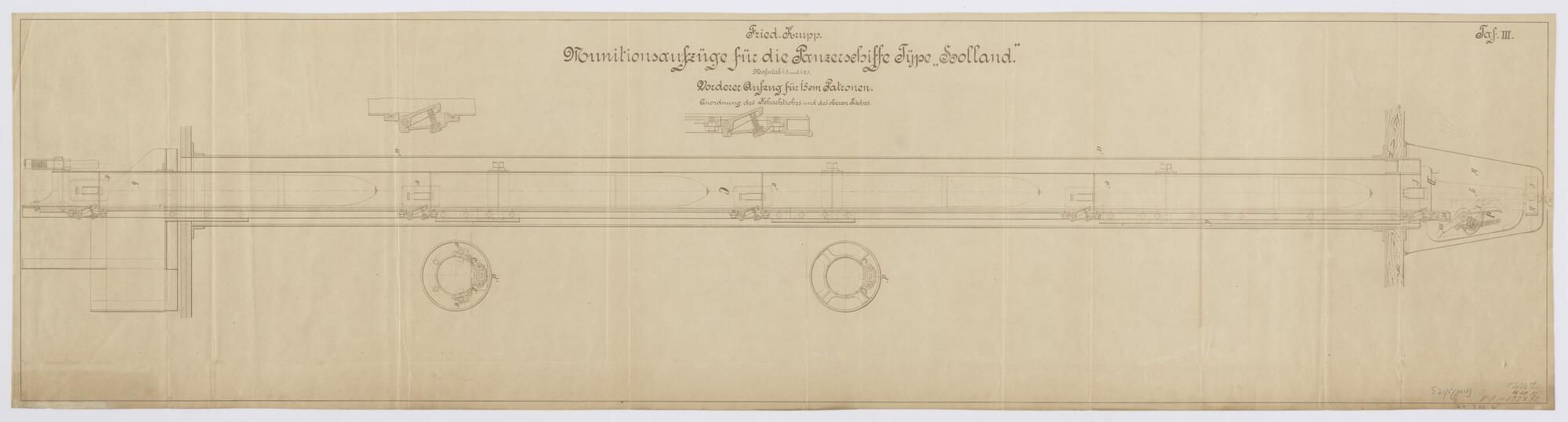 Munitielift voor 15cm patronen van de scheepsklasse van het pantserdekschip Hr.Ms. "Holland" (schaal 1:2,5, 1:5).