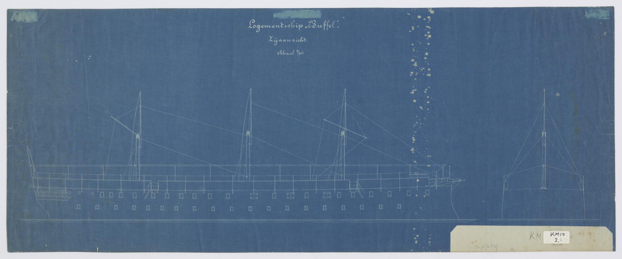 Zijaanzicht over stuurboord van het logementschip Hr.Ms. "Buffel" (schaal 1:96).