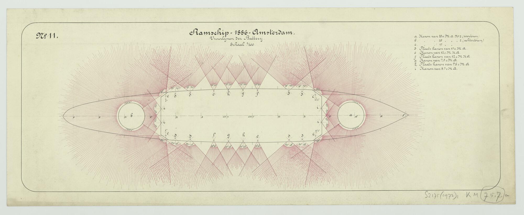 'Ontwerp ramschip "Amsterdam", 1886'. Vuurlijnen der batterij. Originele tekening en transparant afdruk (schaal 1:200).