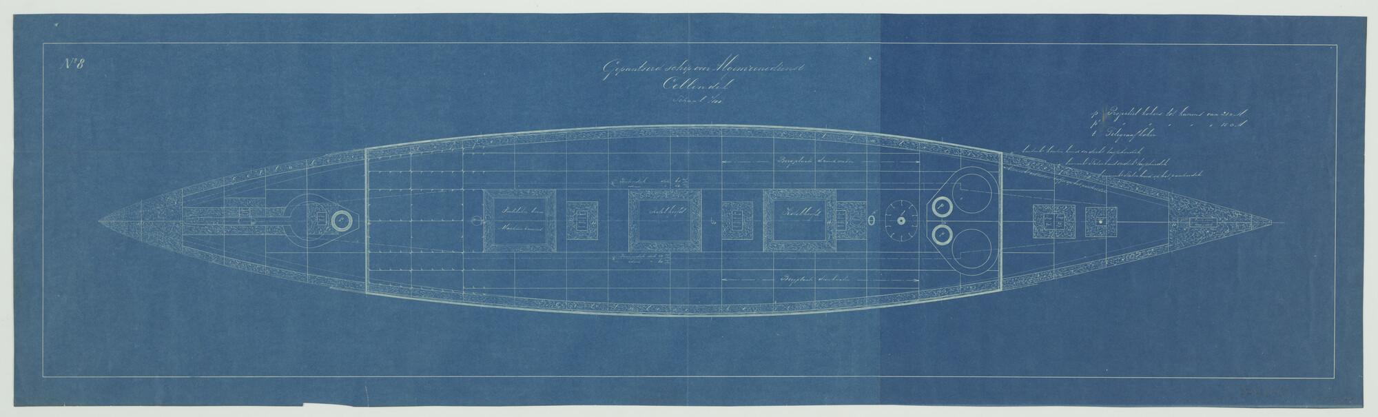 'Gepantserd schip voor algemene dienst 1890'. Cellendek, projectielkokers, telegraafkokers. Bergplaatsen drinkwater. Pantsergordel: houtenhuid onder tussendek en stalenhuid onder tussendek. Cellulose koffer romdom binnenkant scheepshuid en de hoofden (schaal 1:100).