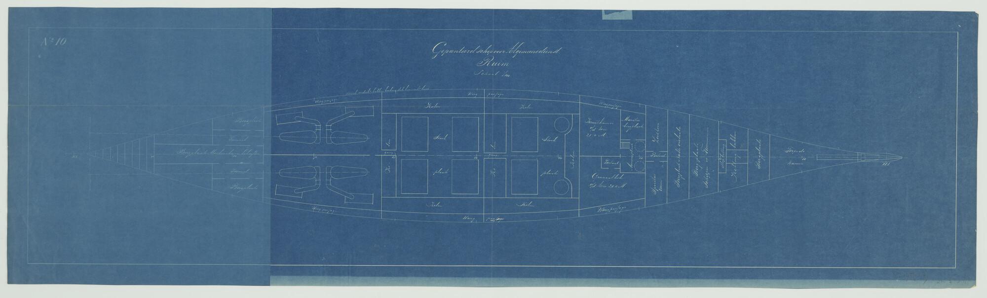 'Gepantserd schip voor algemene dienst 1890'. Indeling ruim en machinekamer (schaal 1:100).