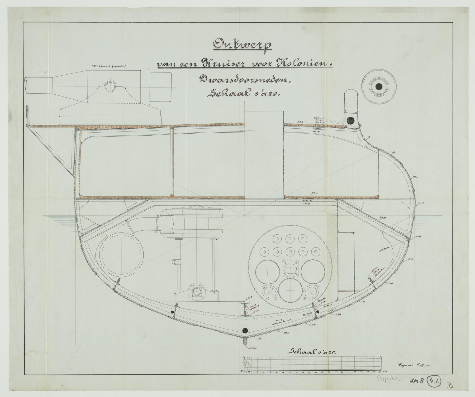 'Ontwerp van een kruiser voor koloniën'. Dwarsdoorsneden over machinekamer en ketelruim (schaal 1:20).