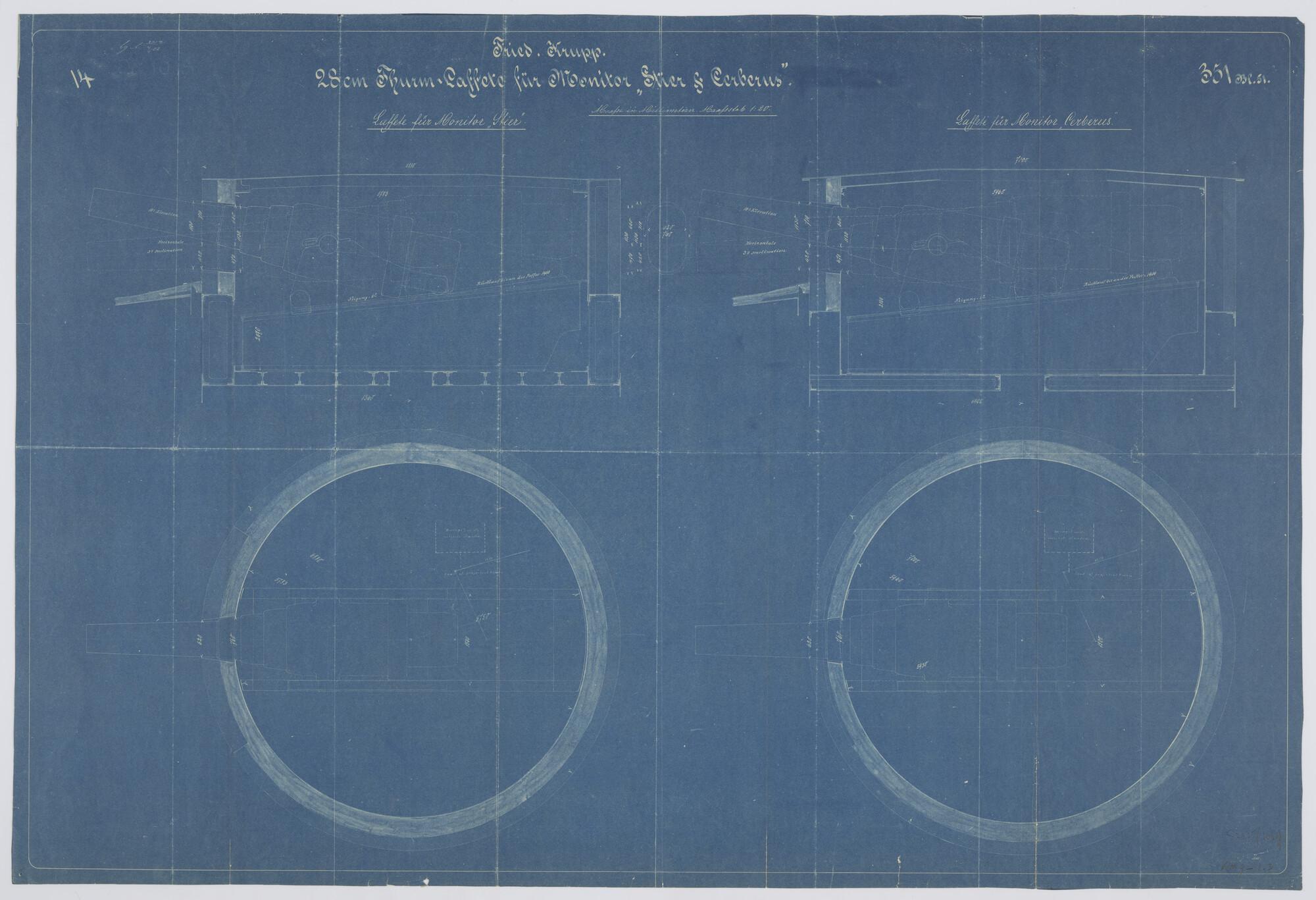Horizontale- en verticale doorsnede van de geschuttoren voor het kanon van 28 cm op het voorschip van het ramschip Zr.Ms. "Stier" en de monitor Zr.Ms. "Cerberus" (schaal 1:20).