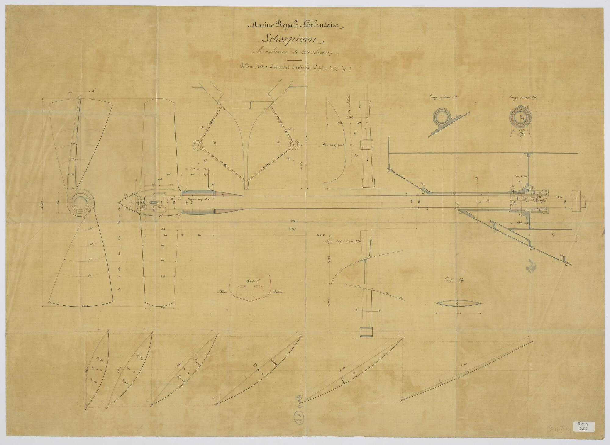 Schroefassen, stoelen en schroef van het ramschip Zr.Ms. "Schorpioen" (schaal 1:5, 1:10).