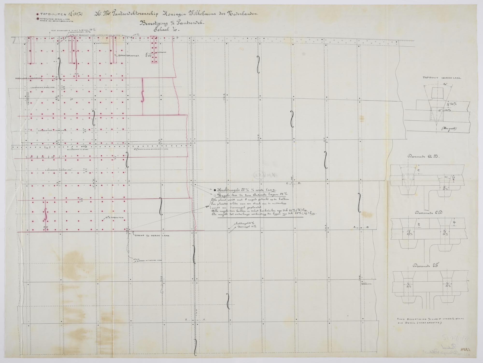Bevestiging van het pantserdek van het pantserdektorenschip Hr.Ms. "Koningin Wilhelmina der Nederlanden". Diverse doorsneden (schaal 1:10).