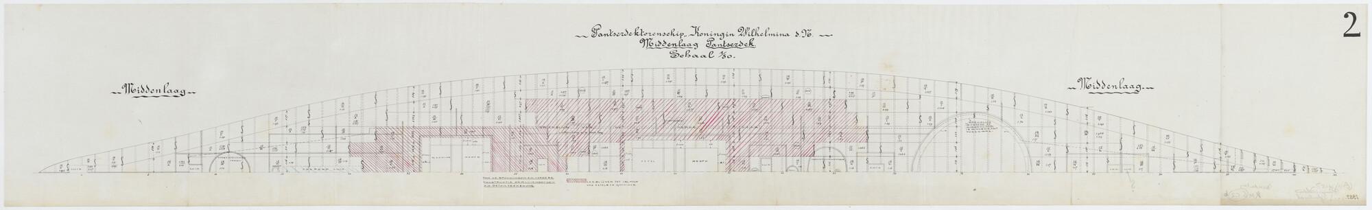Het pantserdek van het pantserdektorenschip Hr.Ms. "Koningin Wilhelmina der Nederlanden". Bovenaanzicht (zijde over bakboord) van de tweede laag (middenlaag) (schaal 1:50).