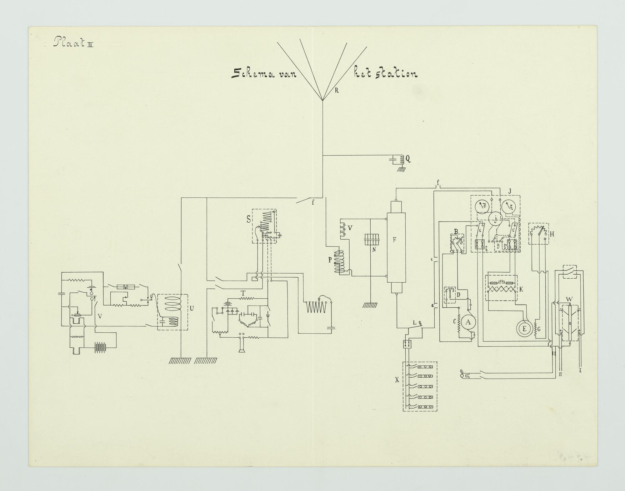 Elektrische schema van het gehoorontvangtoestel en het schrijfontvangtoestel van het pantserdektorenschip Hr.Ms. "Koningin Wilhelmina der Nederlanden". Originele tekening.