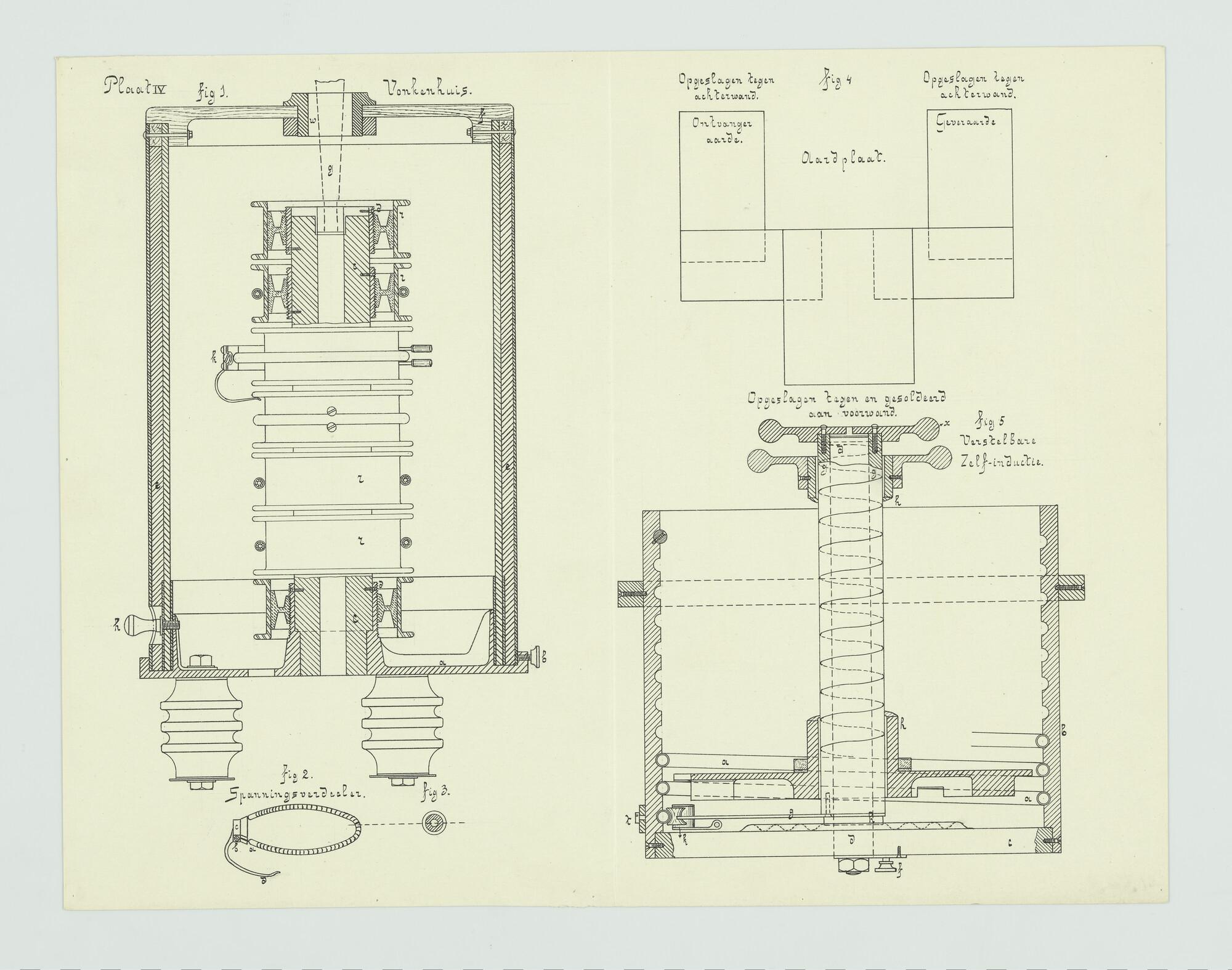 Elektrische schema van het gehoorontvangtoestel en het schrijfontvangtoestel van het pantserdektorenschip Hr.Ms. "Koningin Wilhelmina der Nederlanden". Diverse doorsneden van het vonkenhuis. Originele tekening.