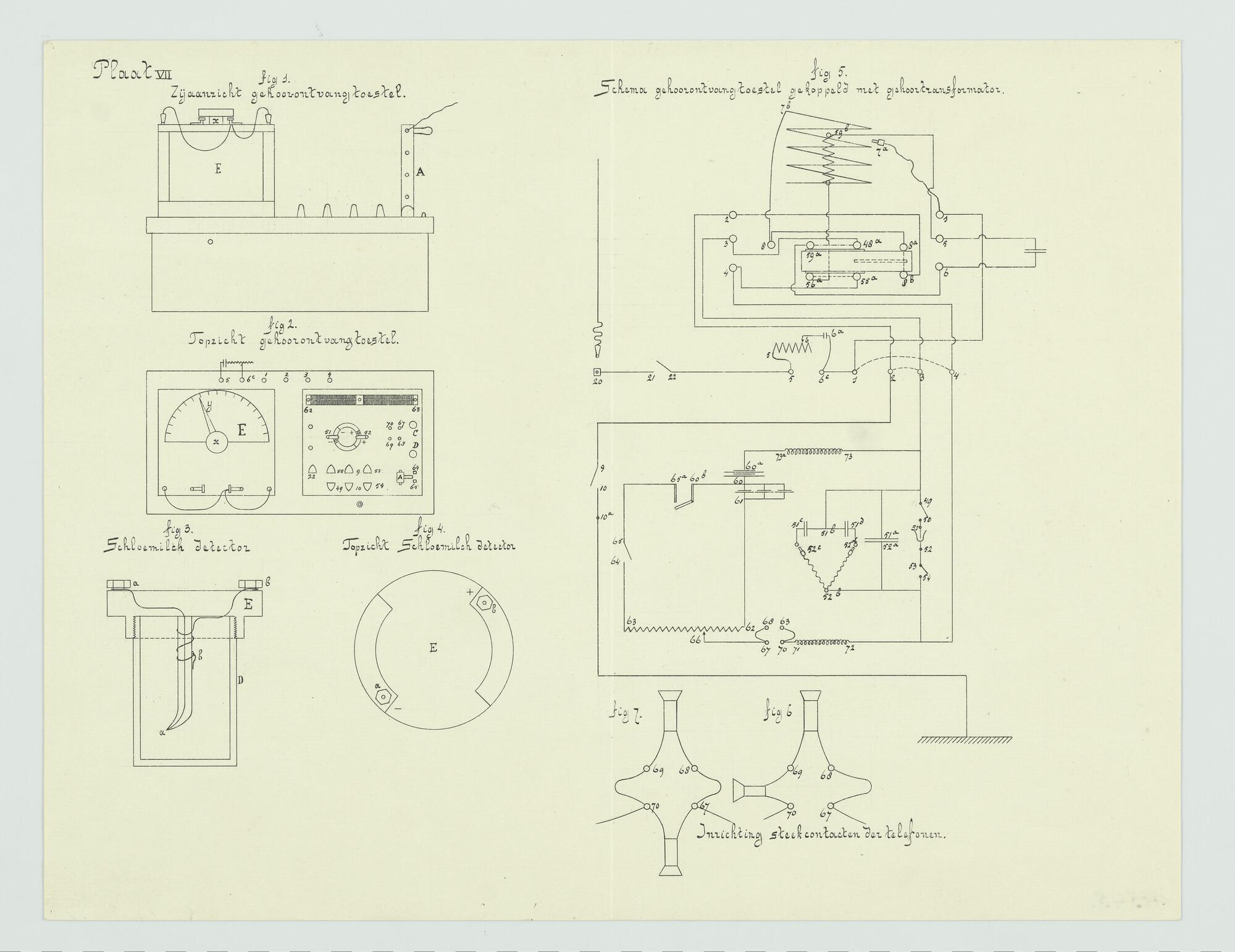 Elektrische schema's van het gehoorontvangtoestel en het schrijfontvangtoestel van het pantserdektorenschip Hr.Ms. "Koningin Wilhelmina der Nederlanden". Diverse aanzichten van het gehoorontvangtoestel en de gehoortransformator. Originele tekening.