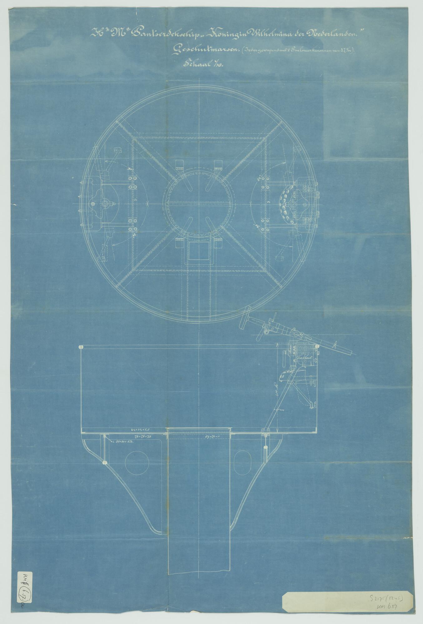 Doorsnede en bovenaanzicht van één van de twee geschutmarsen met twee snelvuurkanons 3.7 cm rev. van het pantserdektorenschip Hr.Ms. "Koningin Wilhelmina der Nederlanden" (schaal 1:10).
