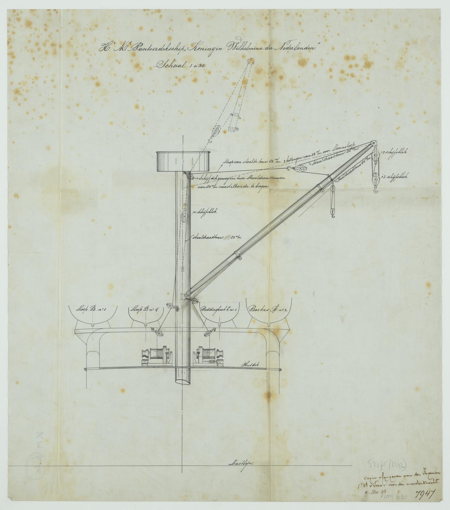 Geschutmars met giek voor het hijsen der sloepen vanaf het hutdek van het pantserdektorenschip Hr.Ms. "Koningin Wilhelmina der Nederlanden". Sloepen B1 en B4, reddingboot C1 en barkas A2 (schaal 1:50).